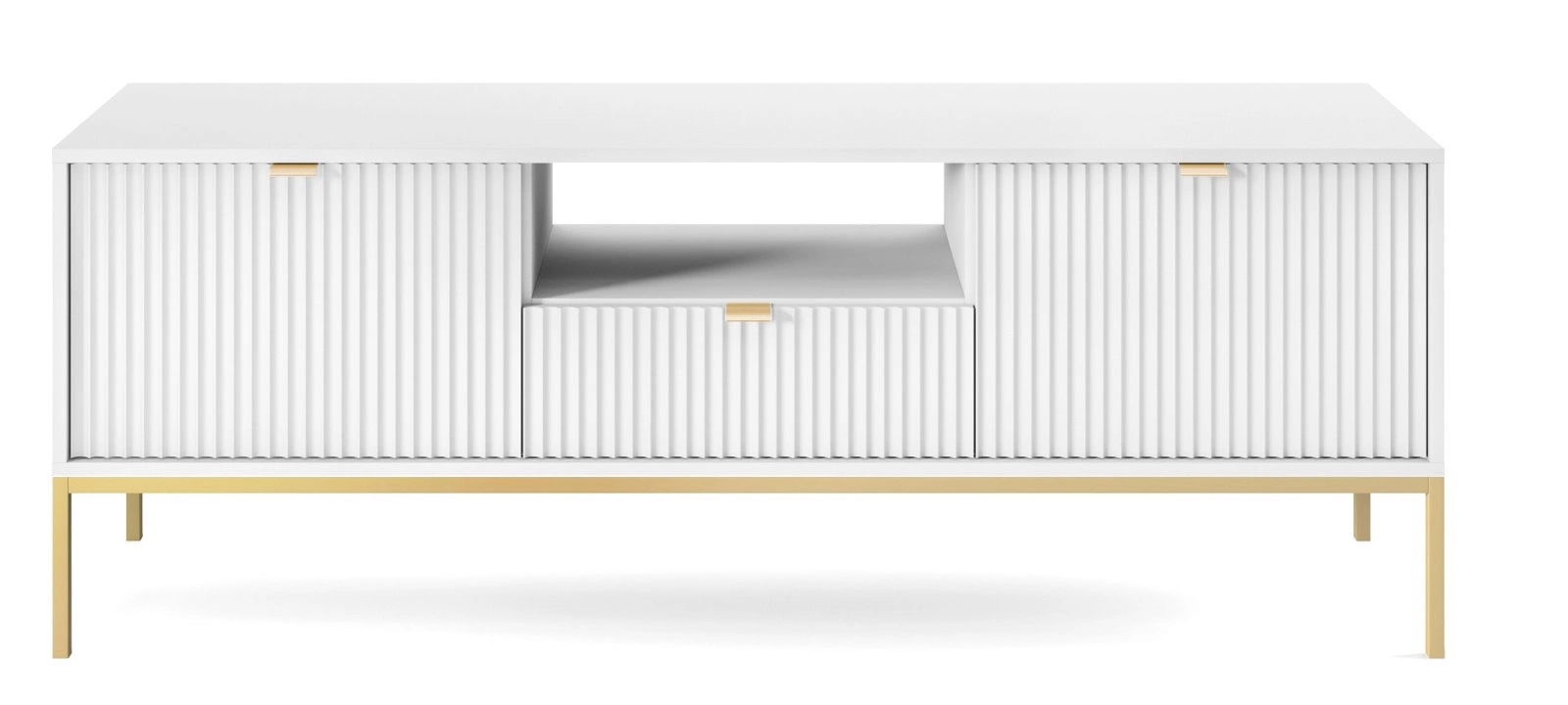 Uzyskaj nowoczesny i stylowy wygląd dzięki ryflowanej szafce Delicious od Intesi. Szafka ma ryflowane fronty szuflad i szafek podkreślone aluminiowym uchwytem w kolorze złotym. Szafka ma 154 cm szerokości i 39 cm głębokości, dzięki czemu idealnie nadaje się do przechowywania dekoderów, ładowarek, konsol do gier i nie tylko!