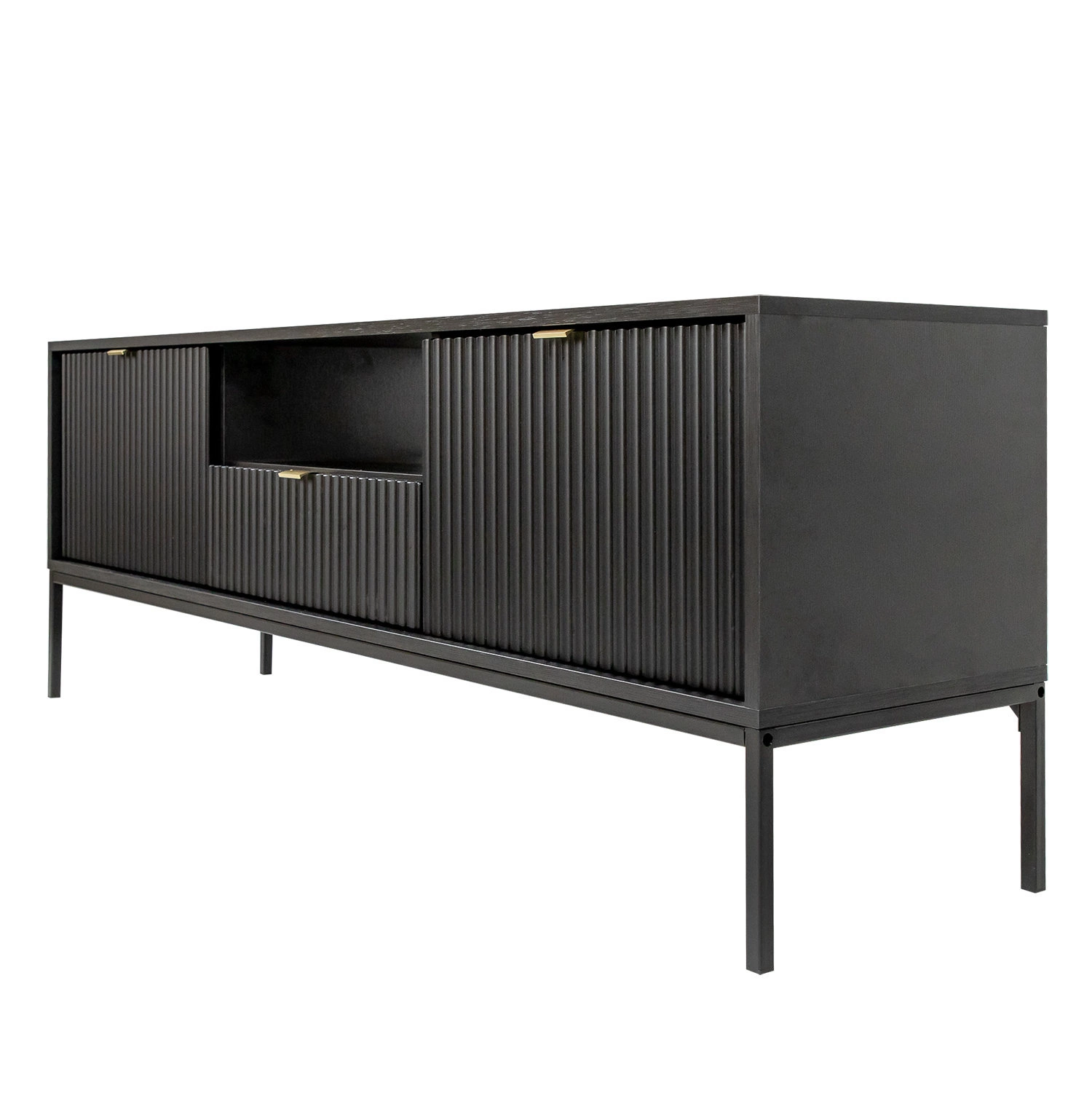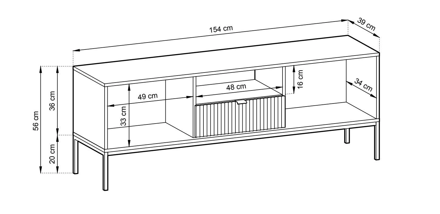 Szafka RTV Delicious z ryflowanymi frontami ozdobi nasze wnętrze w nowoczesnym stylu i doda mu swoistego uroku. Ryflowane front szuflady i szafek podkreślaja stylowy, aluminiowy uchwyt w kolorze złotym. Szafka o szerokości 154 cm i głębokości 39 cm pozwoli na uporządkowanie nie tylko dekoderów oraz odtwarzaczy, ale również innych przedmiotów jak ładowarki telefonów czy konsole do gier. Podstawą stolika są metalowe, stabilne nogi. Szafka na wysokich nogach jest wygodnym meblem, gdyż łatwo jest pod nią odkurzyć oraz wytrzeć podłogę. Cienkie eleganckie nogi dodają jej również wizualnej lekkości, która jest bardzo ważna w niedużych pomieszczeniach.