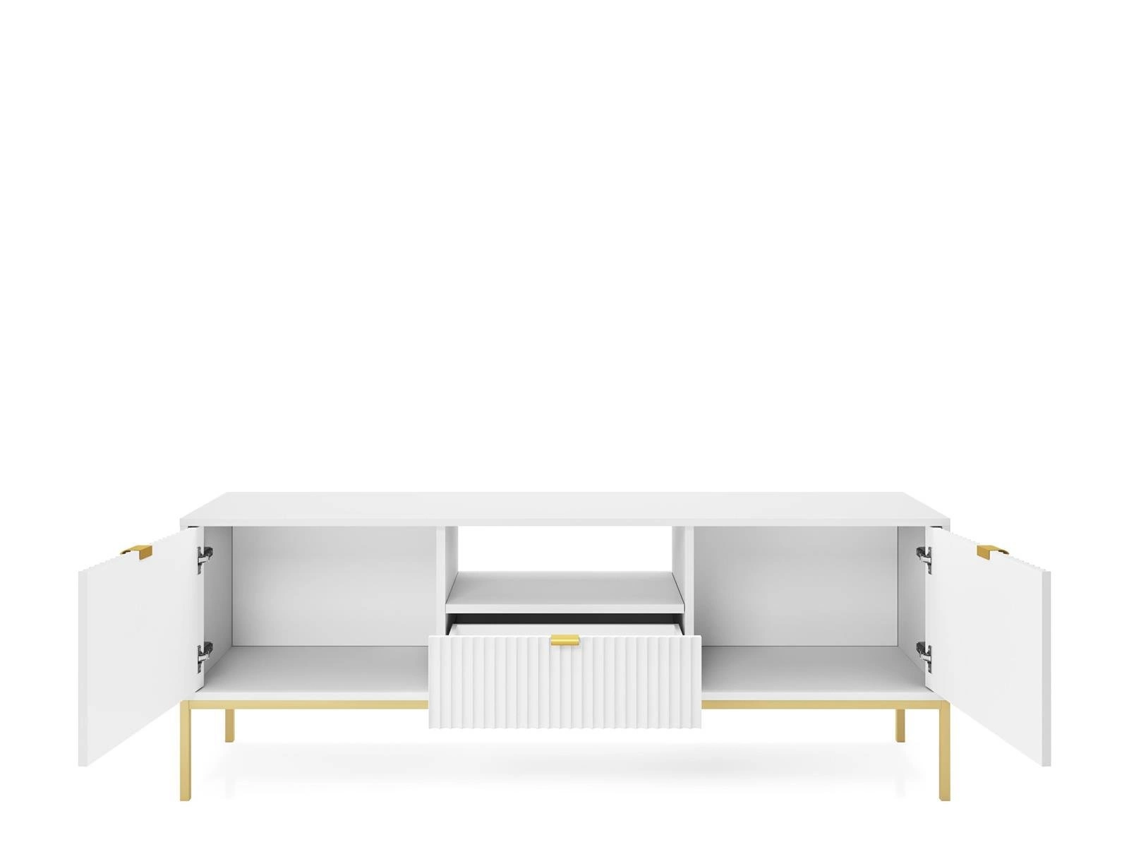 Uzyskaj nowoczesny i stylowy wygląd dzięki ryflowanej szafce Delicious od Intesi. Szafka ma ryflowane fronty szuflad i szafek podkreślone aluminiowym uchwytem w kolorze złotym. Szafka ma 154 cm szerokości i 39 cm głębokości, dzięki czemu idealnie nadaje się do przechowywania dekoderów, ładowarek, konsol do gier i nie tylko!