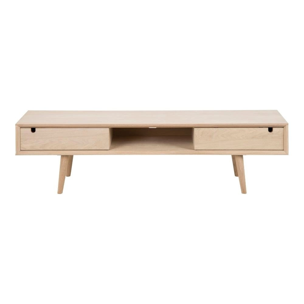 Drewniana szafka w kolorze bielonego dębu to skandynawski szyk w niewielkim meblu. Szafka została zrobiona z dębowego forniru. Półki szafki zakryte zostały przesuwnymi, drewnianymi drzwiczkami. Podstawą szafki są drewniane nogi, które lekko zwężają się ku dołowi. Nogi szafki są lekko rozchylone, dzięki czemu szafka jest bardziej stabilna. Z tyłu szafki został umieszczony otwór, przez który możemy przeciągnąć kable od niezbędnych sprzętów RTV umieszczonych na półce szafki. Waga: 24 kg.