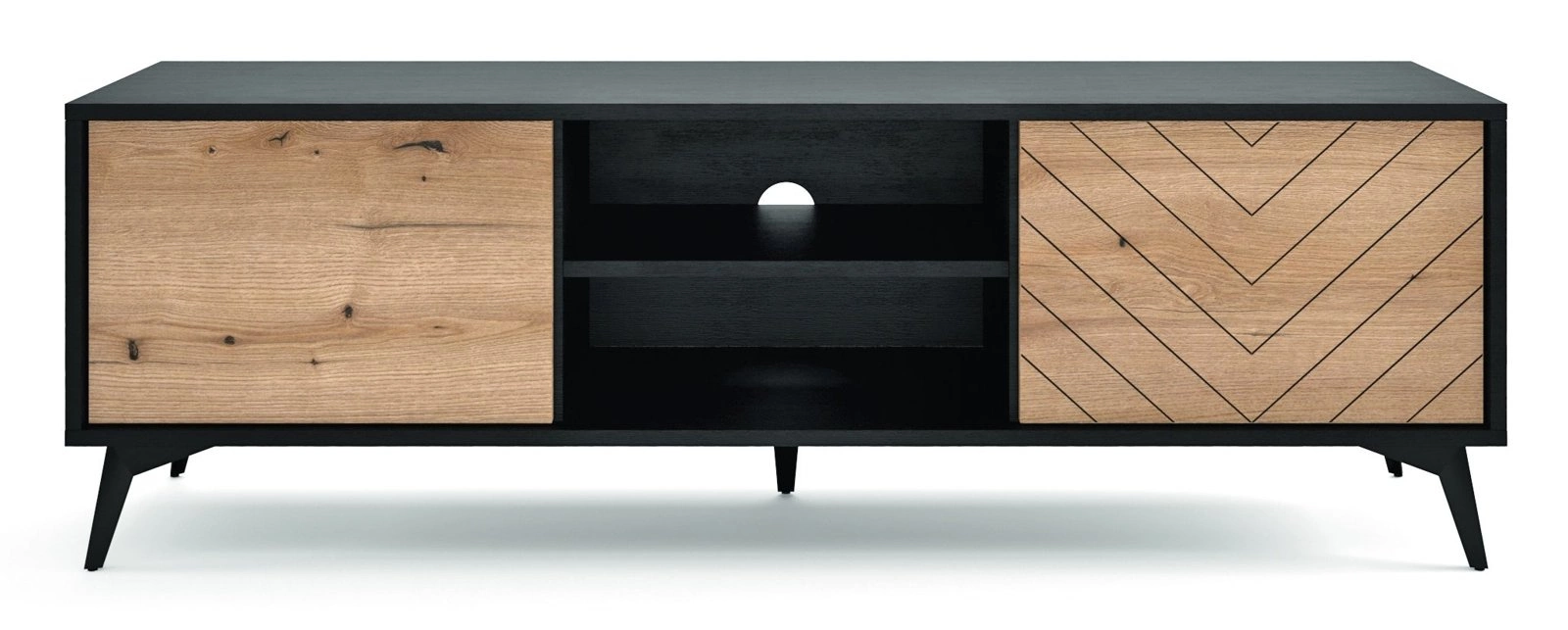 Loftowa szafka RTV na wysokich nóżkach oraz z frontem w jodełkę to sprawdzony przepis na centralne miejsce w salonie lub sypialni. Seria mebli Fargo to połączenie czarnego korpusu mebla z frontami w kolorze dębu. Dodatkowe frezowanie w kształcie jodełki to element, który odróżnia serię Fargo od zwykłych loftowych mebli.