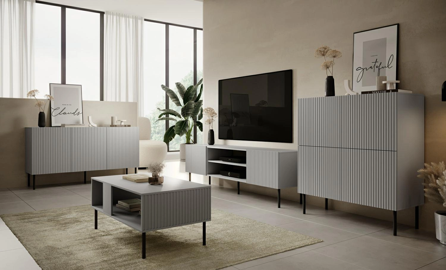 Szafka RTV Harbin szara/czarna Szafka RTV Harbin to niezwykle funkcjonalne i stylowe rozwiązanie, które doskonale wpisuje się w trendy wnętrzarskie. Mebel o imponujących wymiarach 180/42/57 cm został wykonany z wysokiej jakości MDF-u laminowanego, co gwarantuje jego trwałość i estetyczny wygląd. Nogi szafki, wykonane z polipropylenu w kolorze czarnym, stanowią stabilną podstawę. Szafka RTV w kolorze jasnym popielatym jest obecnie jednym z najmodniejszych wyborów. Nadaje meblowi elegancji i lekkości, jednocześnie idealnie komponując się z różnymi stylami wnętrzarskimi. Jednak to nie tylko kolor nadaje meblowi charakteru. Ryflowane fronty są najnowszym trendem, który dodaje meblom niepowtarzalnego wyglądu i oryginalności. To wyjątkowe wykończenie sprawia, że mebel wyróżnia się spośród innych, standardowych rozwiązań. Szafka RTV Harbin oferuje zarówno otwarte półki, jak i zamykane szafki, co stanowi doskonałe rozwiązanie dla osób ceniących nie tylko funkcjonalność, ale również estetykę. Otwarte półki umożliwiają wyeksponowanie dekoracji, natomiast zamykane szafki gwarantują bezpieczeństwo i porządek w przechowywaniu innych akcesoriów, które niekoniecznie muszą być na widoku. Co więcej, szafka RTV jest częścią kolekcji Harbin, co daje możliwość harmonijnego umeblowania całego mieszkania w jednolitym stylu. Mebel ten pozwala na stworzenie spójnej i atrakcyjnej przestrzeni w salonie, spełniając zarówno wymagania funkcjonalne, jak i estetyczne. Co warto wiedzieć przed zakupem? Szafka RTV Harbin to funkcjonalne i stylowe rozwiązanie, które wpisuje się w najnowsze trendy wnętrzarskie. Wykonana z wysokiej jakości MDF-u laminowanego i stabilnych nóg z polipropylenu. Kolor jasnego popielu nadaje meblowi elegancji i harmonijnie komponuje się z różnymi stylami wnętrzarskimi. Ryflowane fronty nadają meblowi oryginalności i niepowtarzalnego wyglądu. Otwarte półki i zamykane szafki zapewniają zarówno możliwość wyeksponowania dekoracji, jak i przechowywania innych akcesoriów w bezpieczny i estetyczny sposób.