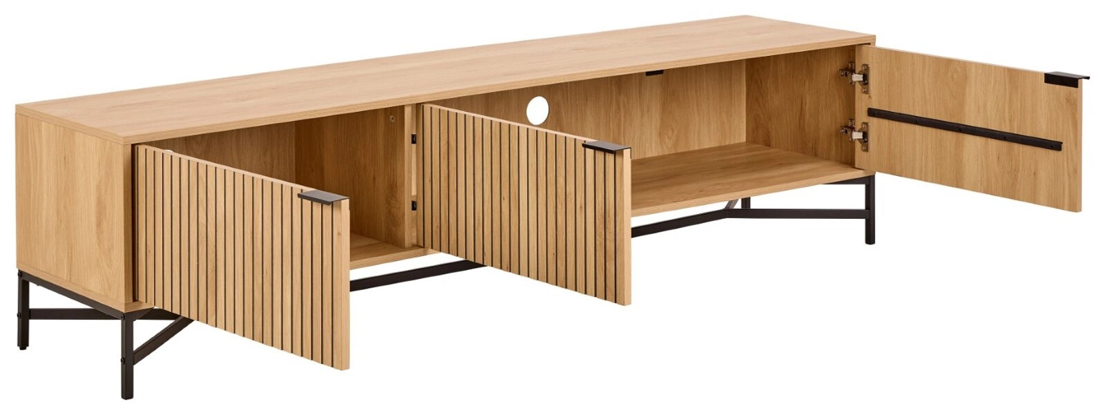 Szafka RTV Jaipur dąb/czarny to nie tylko piękno, ale i funkcjonalność. Wyposażona jest w 3 szafki, otwartą przegrodę i półkę, które umożliwiają przechowywanie różnych przedmiotów, takich jak piloty, gry, płyty DVD, książki czy dekoracje. Dodatkowo, szafka posiada otwór na przewód RTV, co pozwala na estetyczne ukrycie kabli.