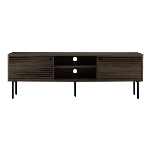 Szafka RTV Kyoto marki House Nordic to loftowa szafka pod telewizor o szerokości 150 cm, łącząca dębowy fornir w dymionym odcieniu z czarną stalową podstawą. Wyposażona w dwie zamykane szafki, dwie otwarte półki oraz praktyczny otwór na przewody RTV, tworzy funkcjonalne centrum multimedialne do salonu lub pokoju młodzieżowego.