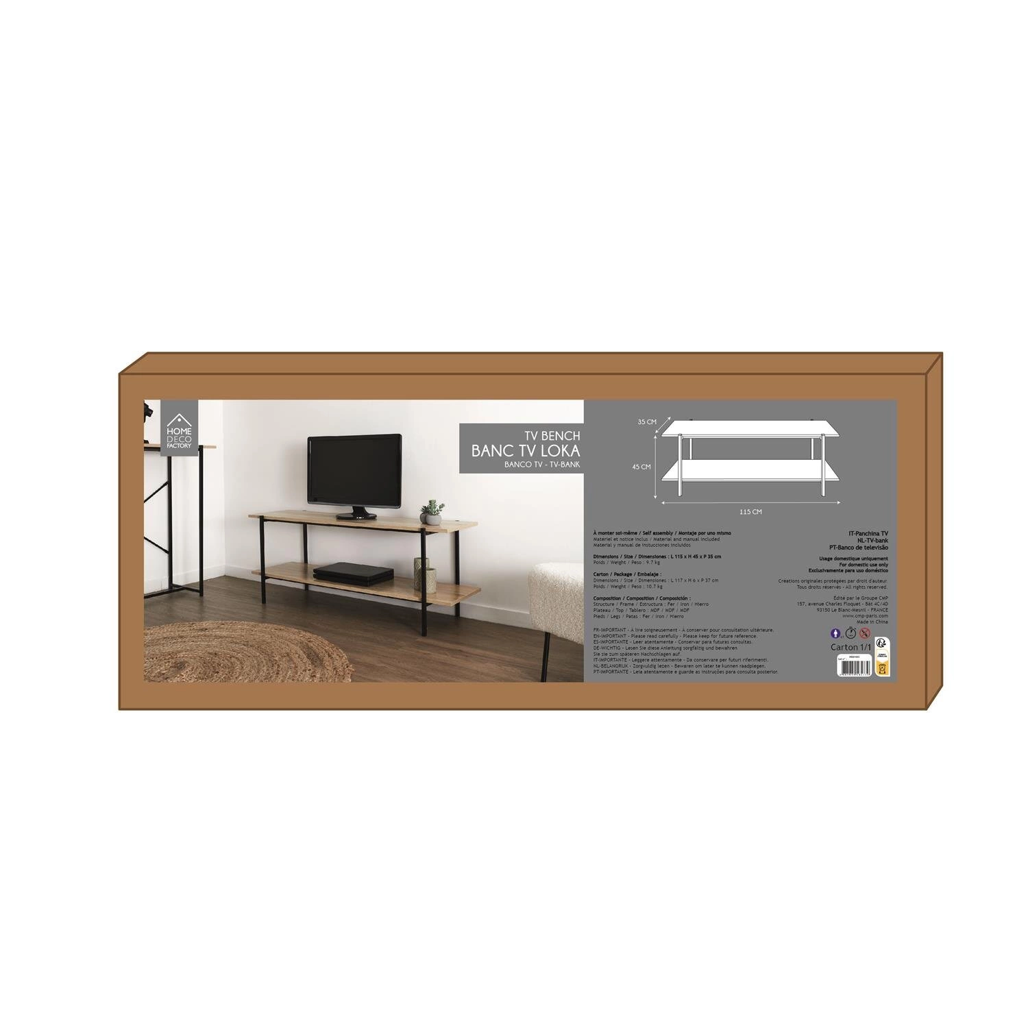 Szafka RTV loftowa Loka 115 cm marki Intesi to propozycja, która doskonale łączy **nowoczesny styl loftowy** z praktycznymi rozwiązaniami do każdego salonu. Kompaktowe wymiary (115×35×45 cm), naturalny blat oraz solidna, czarna podstawa na czterech metalowych nogach sprawiają, że ta szafka pod telewizor świetnie sprawdzi się nawet w niewielkich przestrzeniach. Dzięki dwóm otwartym półkom zyskujesz wygodne miejsce na sprzęt RTV, konsolę, kolekcję filmów lub dekoracje.Nowoczesny styl loftowy w Twoim wnętrzu