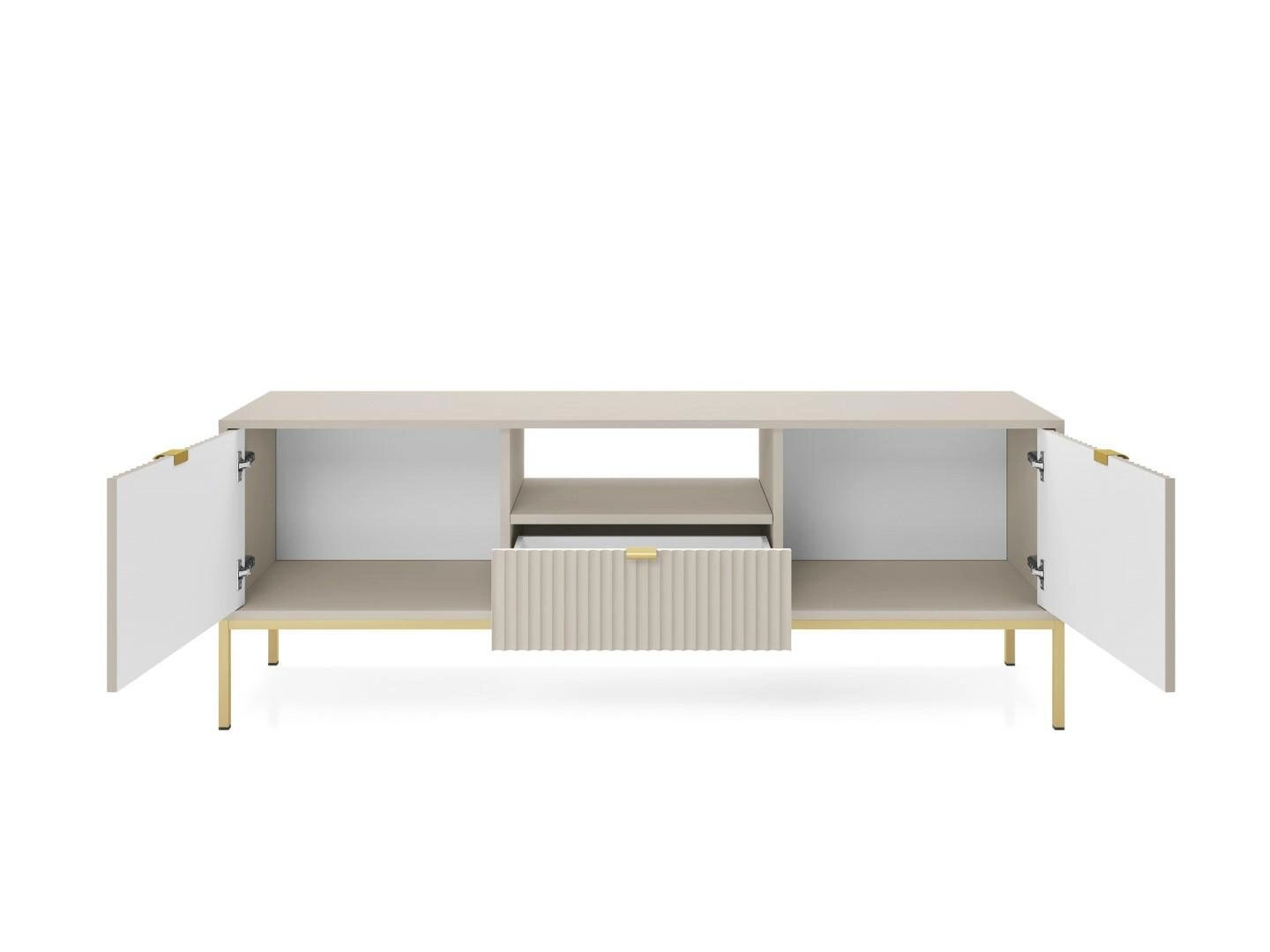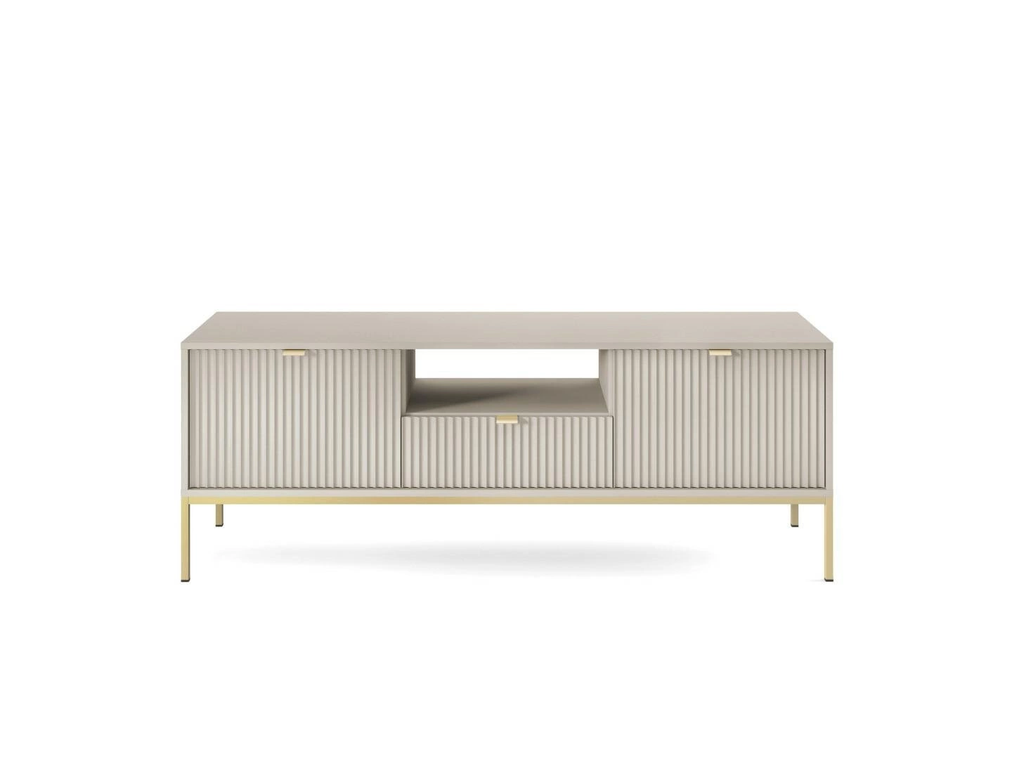 Szafka RTV Delicious z płyty meblowej w kolorze kaszmiru to połączenie nowoczesności i glamour. Ryflowane fronty dodają meblowi oryginalności, a złote, metalowe nogi - elegancji. Cienkie, wysokie nogi sprawiają, że mebel wydaje się lekki, co jest niezwykle ważne w mniejszych pomieszczeniach.