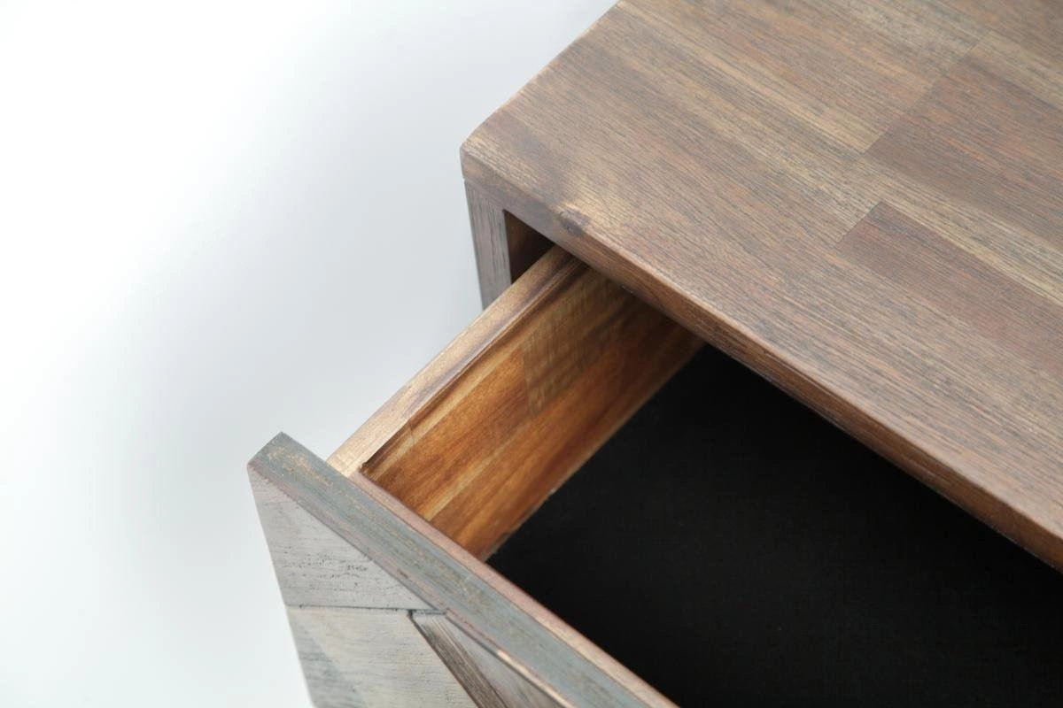 Dzięki dwóm szufladom i półkom z przesuwnymi drzwiami oraz intarsją w jodełkę, szafka Tonis zapewnia wiele miejsca na przechowywanie sprzętów RTV, konsol, pilotów i innych akcesoriów. Uchwyty w kolorze mosiądzu dodają jej elegancji i oryginalności. Szafka Tonis świetnie sprawdzi się w salonie, pokoju dziennym, sypialni czy nawet w biurze. Świetnie sprawdzi się nie tylko w salonie czy pokoju dziennym, ale także w sypialni czy biurze. Ta piękna szafka wykonana z litego drewna akacji u zapewni nie tylko funkcjonalność, ale także przytulną atmosferę w Twoim domu.