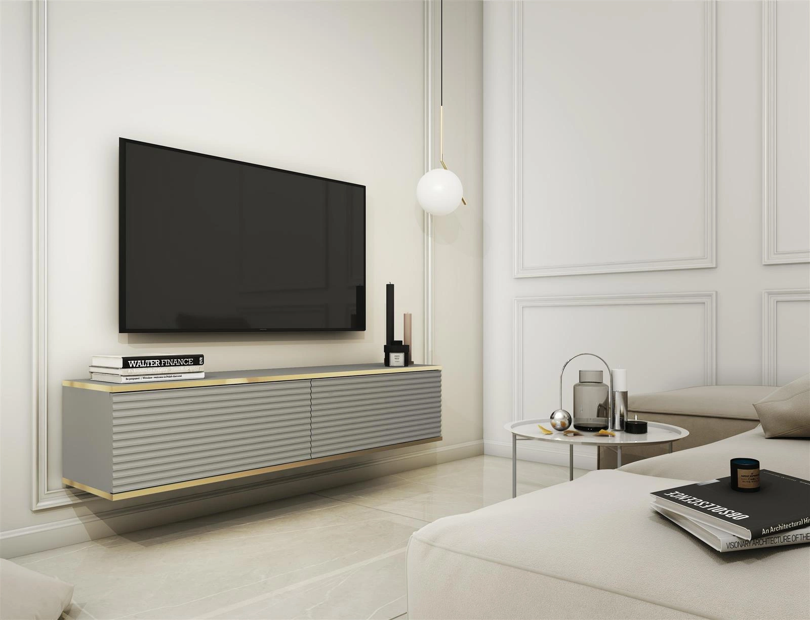 Wisząca szafka rtv pod telewizor pozwala łatwo utrzymać porządek w strefie multimedialnej. Dwie zamykane szafki oraz dwie praktyczne półki umożliwiają wygodne przechowywanie dekoderów, konsoli, kolekcji płyt czy innych akcesoriów. Brak klasycznych uchwytów podkreśla nowoczesny charakter, a gładkie, frezowane fronty są łatwe do utrzymania w czystości. Montaż na ścianie zapewnia wygodny dostęp do wszystkich urządzeń i ułatwia sprzątanie pod meblem.