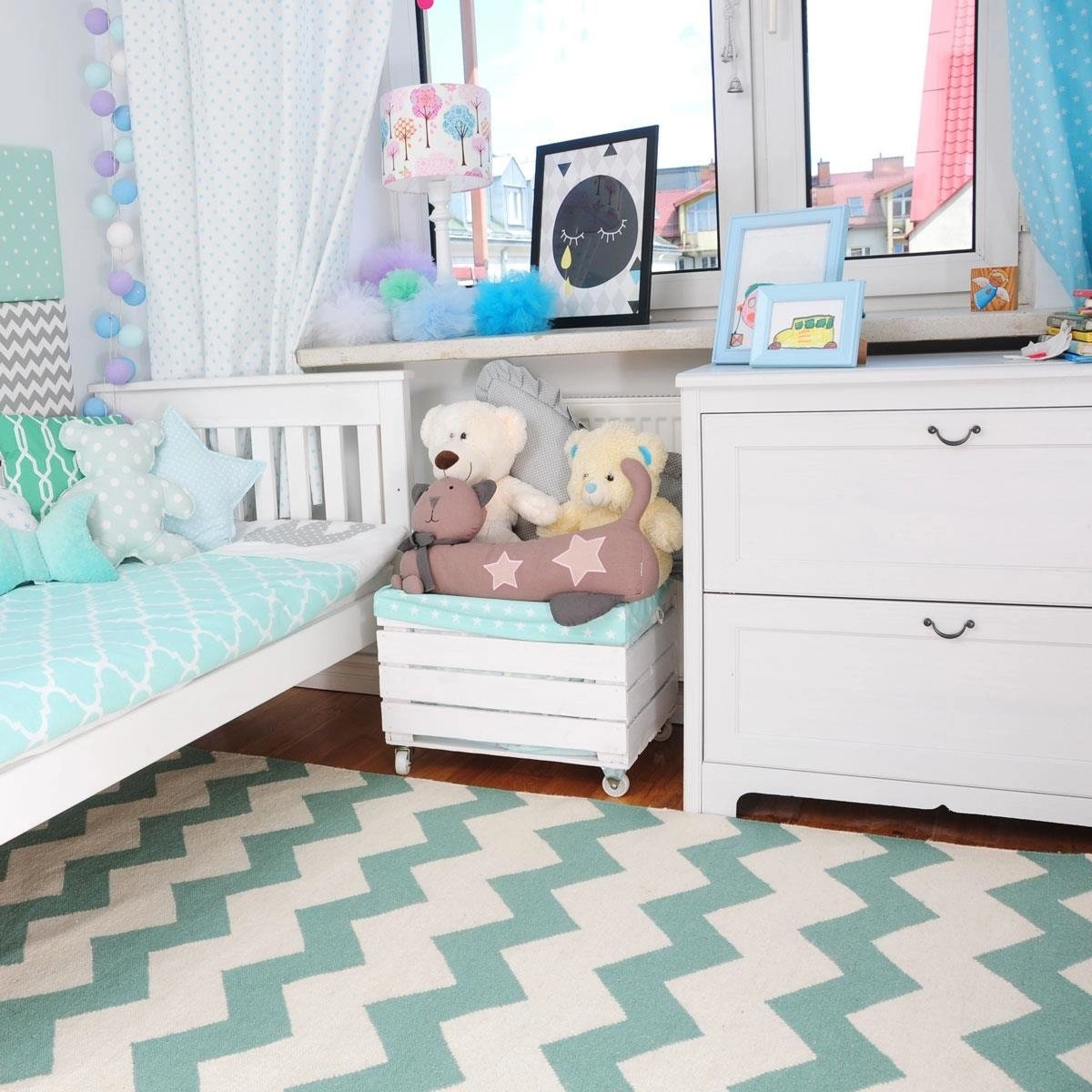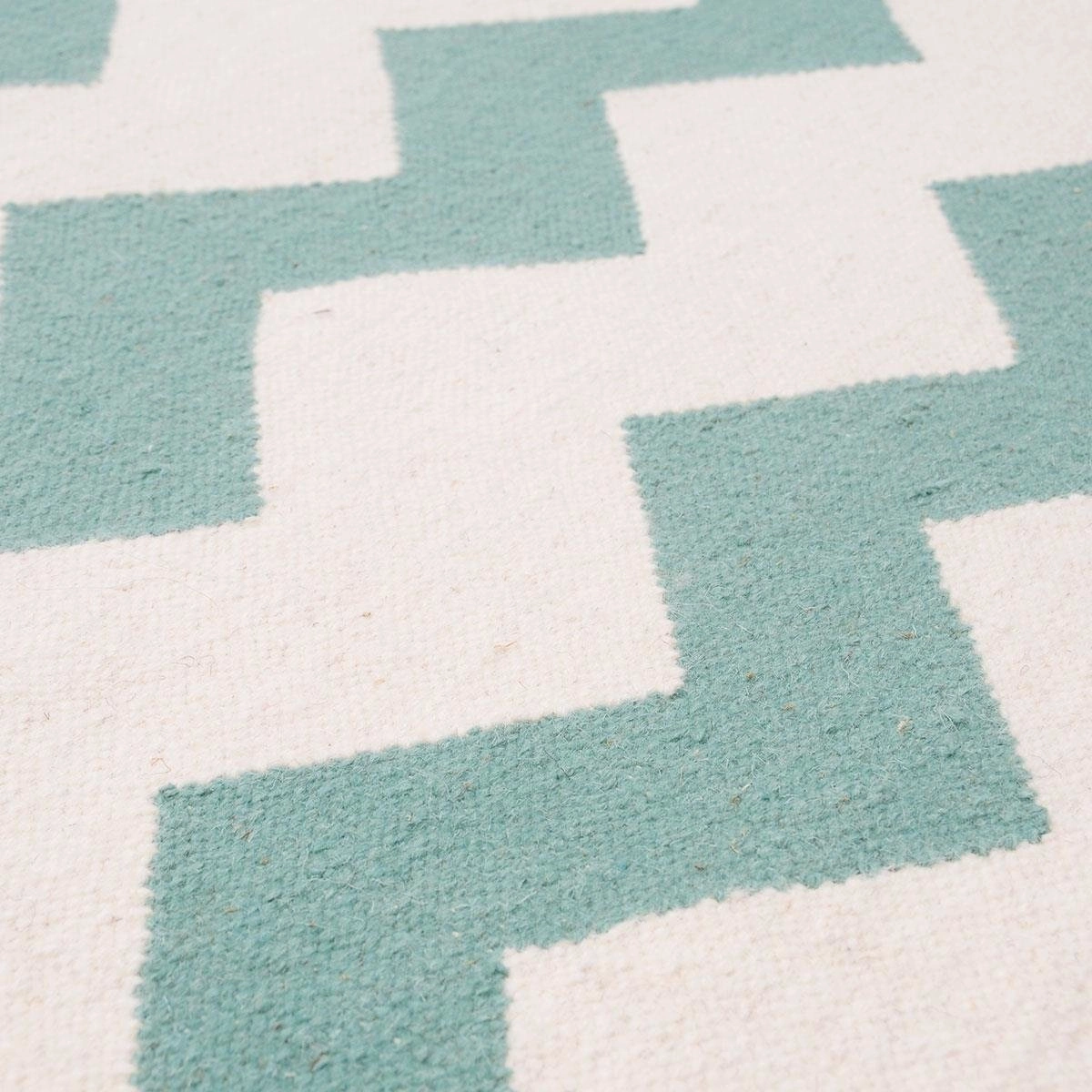 Elegancki, dekoracyjny biało-miętowy dywan Chevron to propozycja dla osób lubiących klasyczne wzory i kolory, które są znakiem rozpoznawalnym apartamentów na Manhattanie.Tkany na płasko i wykonany ręcznie w Indiach (więcej o pielęgnacji i czyszczeniu) zachwyca swoim wyglądem i idealnie prezentuję się na każdej podłodze. Materiały, z których został wykonany gwarantują jakość przez długie lata.