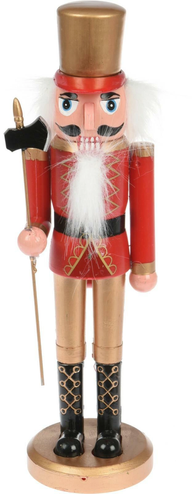 Dekoracja dziadek do orzechów w w czerwono złotych barwach świąt to hit każdych świąt bożego narodzenia. Sympatyczny żołnierz o puchatych białych włosach skradnie serce domowników. Świąteczny dziadek do orzechów dopełni świąteczną aranżację. Duży, bo aż 28-centymetrowy, dziadek został zrobiony ze sztucznego tworzywa, dzięki czemu jest wytrzymalszy od jego drewnianych odpowiedników. Dziadek posiada okrągłą podstawkę, dzięki której stoi stabilnie, więc śmiało możemy nim ozdobić stół na świąteczny obiad lub kominek.