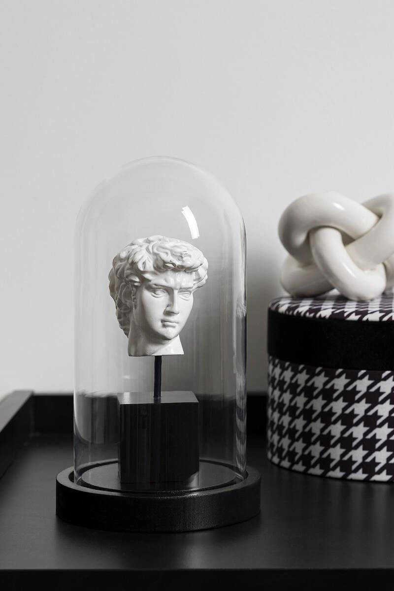 Ta figurka dekoracyjna Dawid pod szkłem to propozycja dla miłośników wyrafinowanego stylu glamour. Czarno-biała kolorystyka oraz starannie dobrane materiały – szkło, tworzywo sztuczne i metal – sprawiają, że ozdoba pięknie odbija światło i wprowadza do wnętrza nutę luksusu. Kultowy wizerunek Dawida, zamknięty w szklanym kloszu, to nie tylko ozdoba, ale także symbol ponadczasowej klasy i dobrego gustu. Idealnie uzupełnia aranżacje w salonie lub sypialni, podkreślając indywidualny charakter przestrzeni.