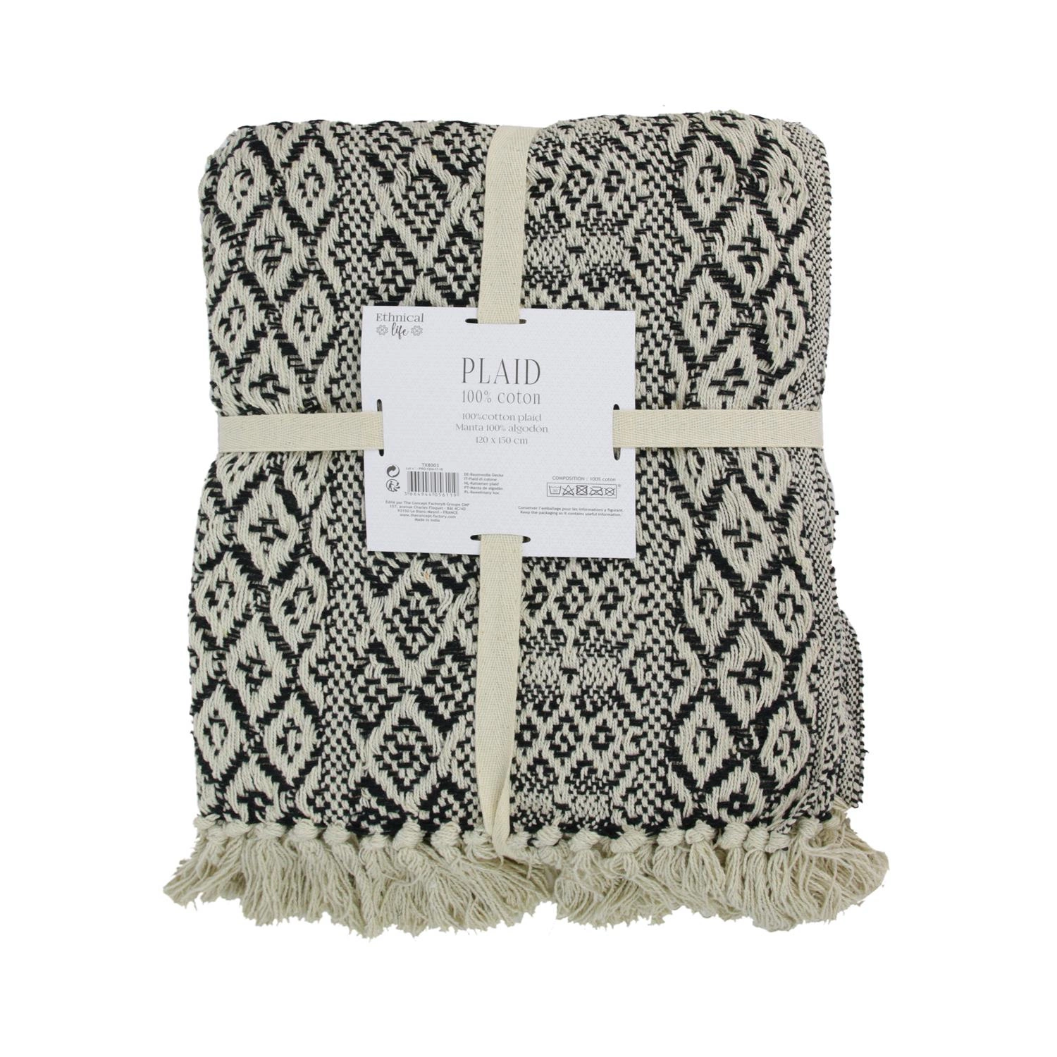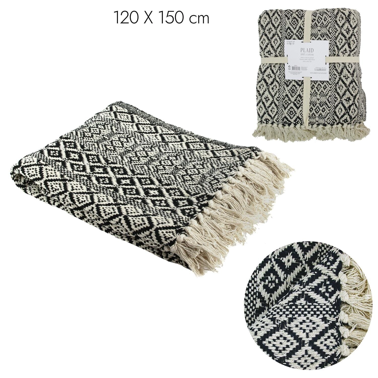 Narzuta bawełniana etniczna czarno-biała z frędzlami 120x150 cm Intesi to stylowy i funkcjonalny dodatek, który odmieni wygląd Twojego łóżka. Wykonana w 100% z naturalnej bawełny, zachwyca nowoczesnym, etnicznym wzorem w odcieniach czerni i bieli oraz dekoracyjnymi frędzlami. Prostokątny kształt i kompaktowy rozmiar sprawiają, że narzuta doskonale sprawdzi się zarówno w sypialni, jak i w salonie – jako narzuta na łóżko, pled na kanapę lub stylowy koc do otulenia się w chłodniejsze wieczory.