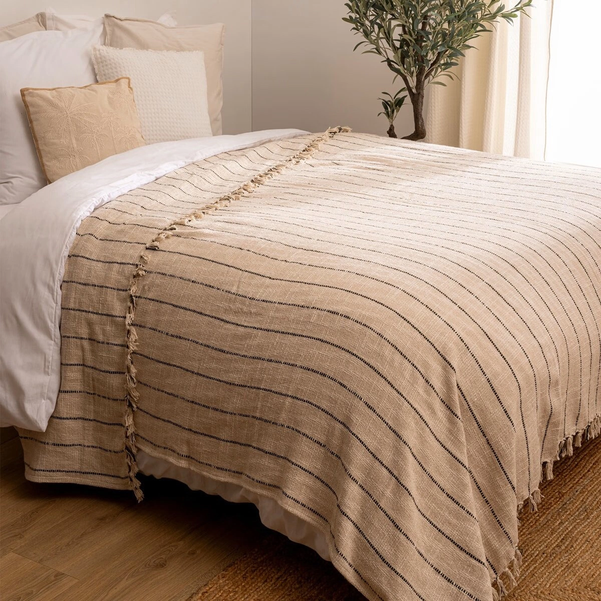 Luisa to narzuta stworzona z myślą o miłośnikach minimalistycznych, nowoczesnych aranżacji. Beżowy kolor doskonale komponuje się z jasnymi i stonowanymi wnętrzami, wprowadzając wrażenie spokoju i ładu. Delikatne frędzle nadają jej lekkości, a jednocześnie sprawiają, że całość prezentuje się bardzo modnie i ponadczasowo. Taki wybór pozwala łatwo odmienić wygląd łóżka, bez konieczności kosztownego remontu czy wymiany mebli.