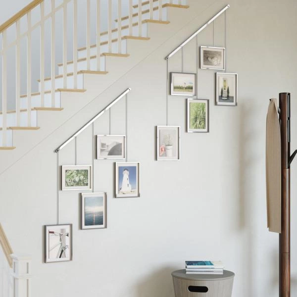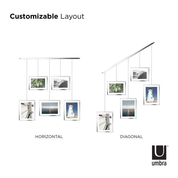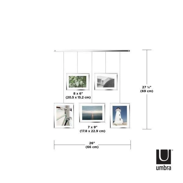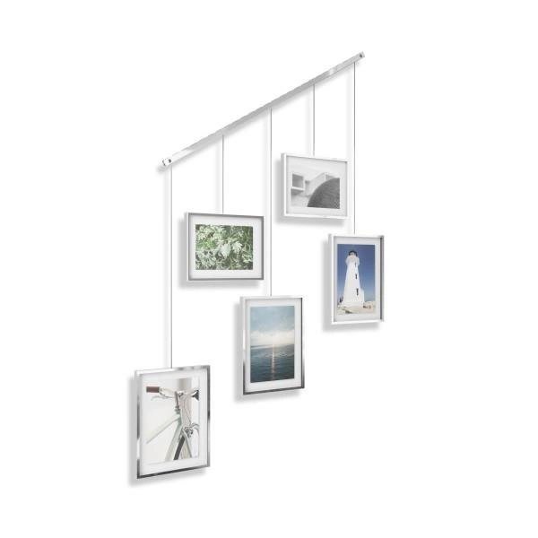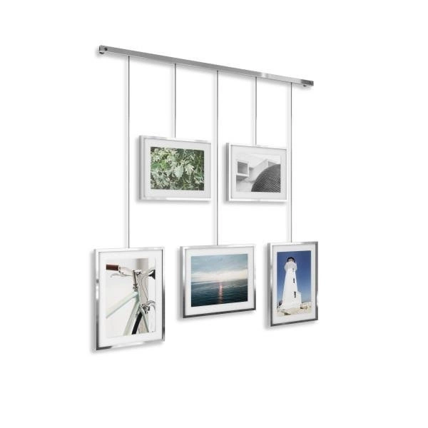 Wieszanie i poziomowanie wielu ramek do zdjęć na ścianie może być kłopotliwe. Idealnym rozwiązaniem na powieszenie wielu ulubionych zdjęć jest ramka Exhibit. Posiada ona listwę ze szczotkowanego metalu z klipsami i wspornikami do trzymania pięciu ramek na zdjęcia o różnych rozmiarach. Dzięki Exhibit możemy tworzyć ciekawe kolaże zdjęć, a wszystko to przy jednoczesnym zmniejszeniu uszkodzeń ścian. Wsporniki z ramkami są zawieszone na listwie, co umożliwia ich przesuwanie w celu tworzenia różnych układów zdjęć. Jego elastyczne właściwości zawieszenia w poziomie sprawiają, że Exhibit jest doskonałym dodatkiem do wieszania na ukos np. przy schodach. W ramki możemy umieścić zdjęcia maksymalnie o wymiarach 10x15cm oraz 13x18cm.