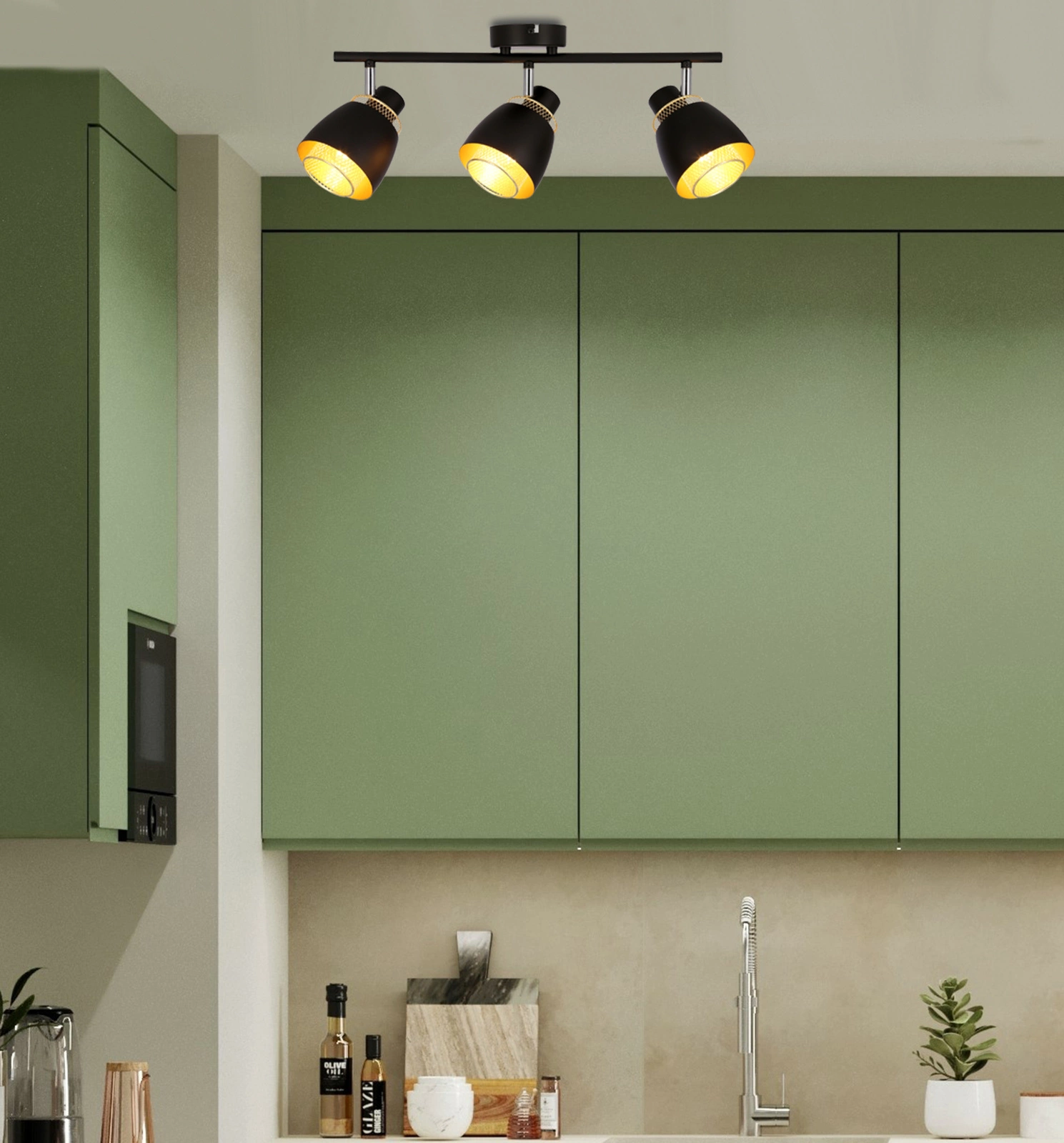 Lampa sufitowa Aleksandria to idealne połączenie nowoczesności z klasycznym stylem. Jej czarne, metalowe klosze z charakterystycznym złotym koszyczkiem dodadzą elegancji każdemu wnętrzu. Dzięki możliwości regulacji kąta padania światła, lampa umożliwia dostosowanie oświetlenia do indywidualnych potrzeb. Może stanowić centralny punkt oświetlenia w salonie, kuchni czy jadalni, a także świetnie sprawdzi się w sypialni czy pokoju młodzieżowym.