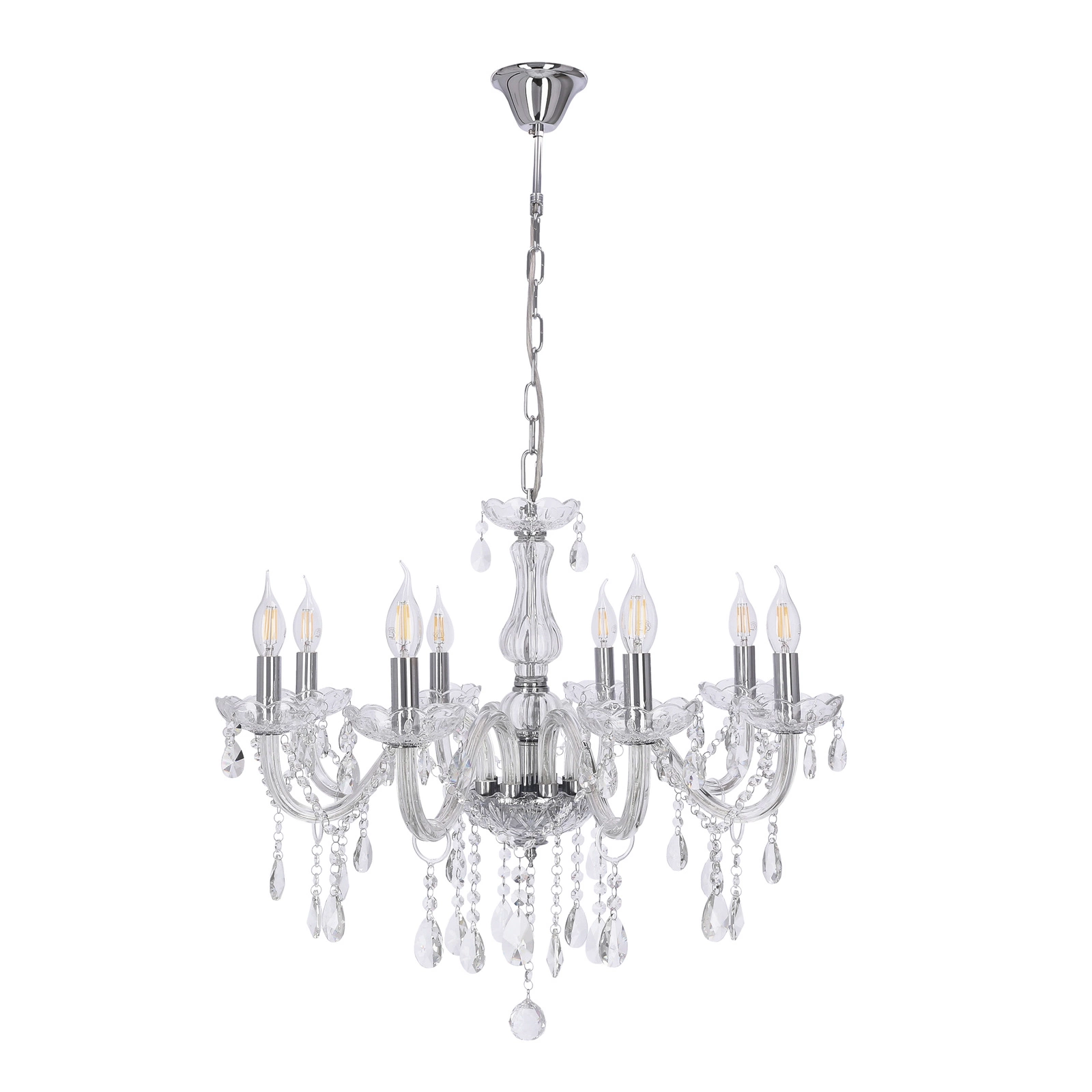 Podkreśl wyjątkowy charakter swojego wnętrza z lampą wiszącą Cristallo. Ta niezwykła lampa ozdobiona transparentnymi elementami, sprawi, że każde pomieszczenie zyska na elegancji i wyrafinowaniu. Wyposażona w osiem oprawek E14, zapewnia przyjemne i równomierne oświetlenie, idealne do tworzenia przytulnej atmosfery w salonie czy sypialni.