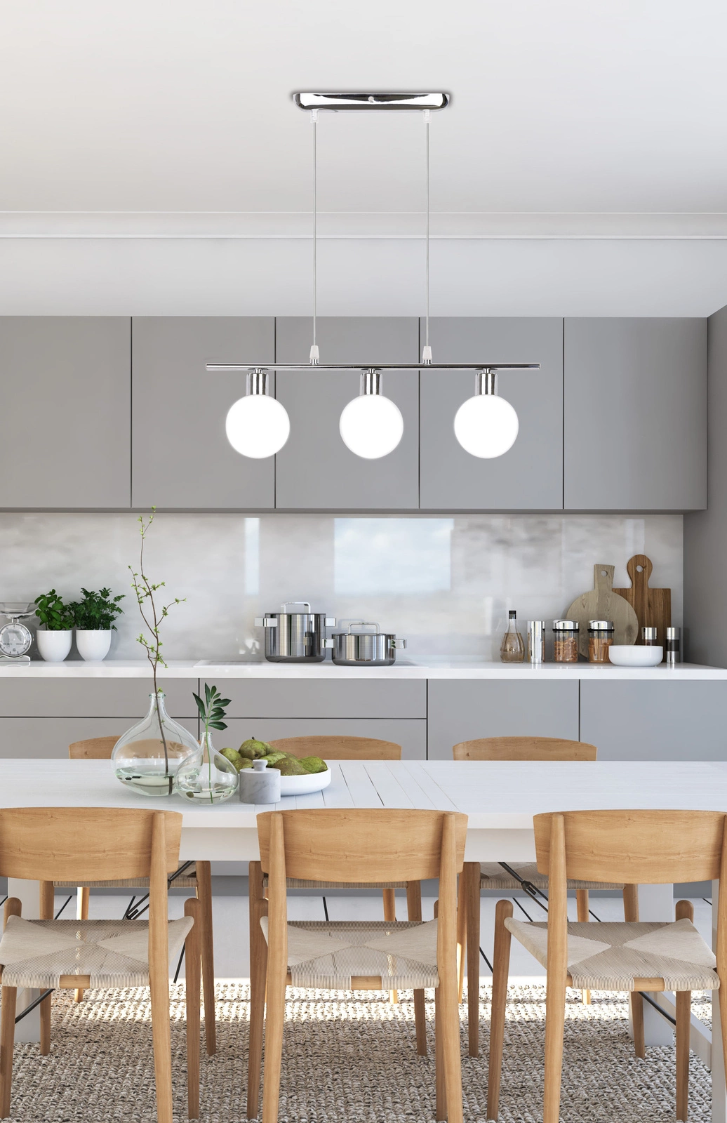 Lampa wisząca kula Oden marki Candellux to nowoczesna propozycja oświetlenia, która zachwyca minimalistycznym designem i funkcjonalnością. Trzy kuliste klosze z białego szkła, umieszczone na chromowanej podsufitce, tworzą harmonijną kompozycję idealną do salonu lub sypialni. Z szerokością 52 cm i wysokością 80 cm, ten model doskonale sprawdzi się jako główna lampa sufitowa nad stołem, w centralnej części pokoju czy w strefie wypoczynkowej.