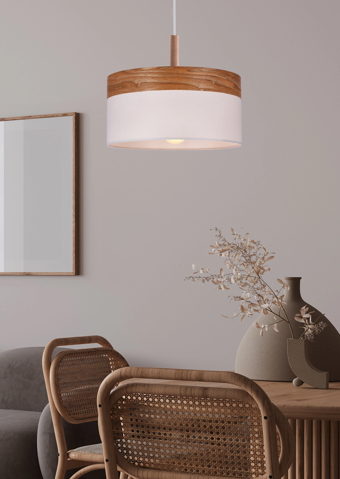 - Pojedyncza lampa wisząca z abażurem – idealna nad stół, do salonu lub sypialni