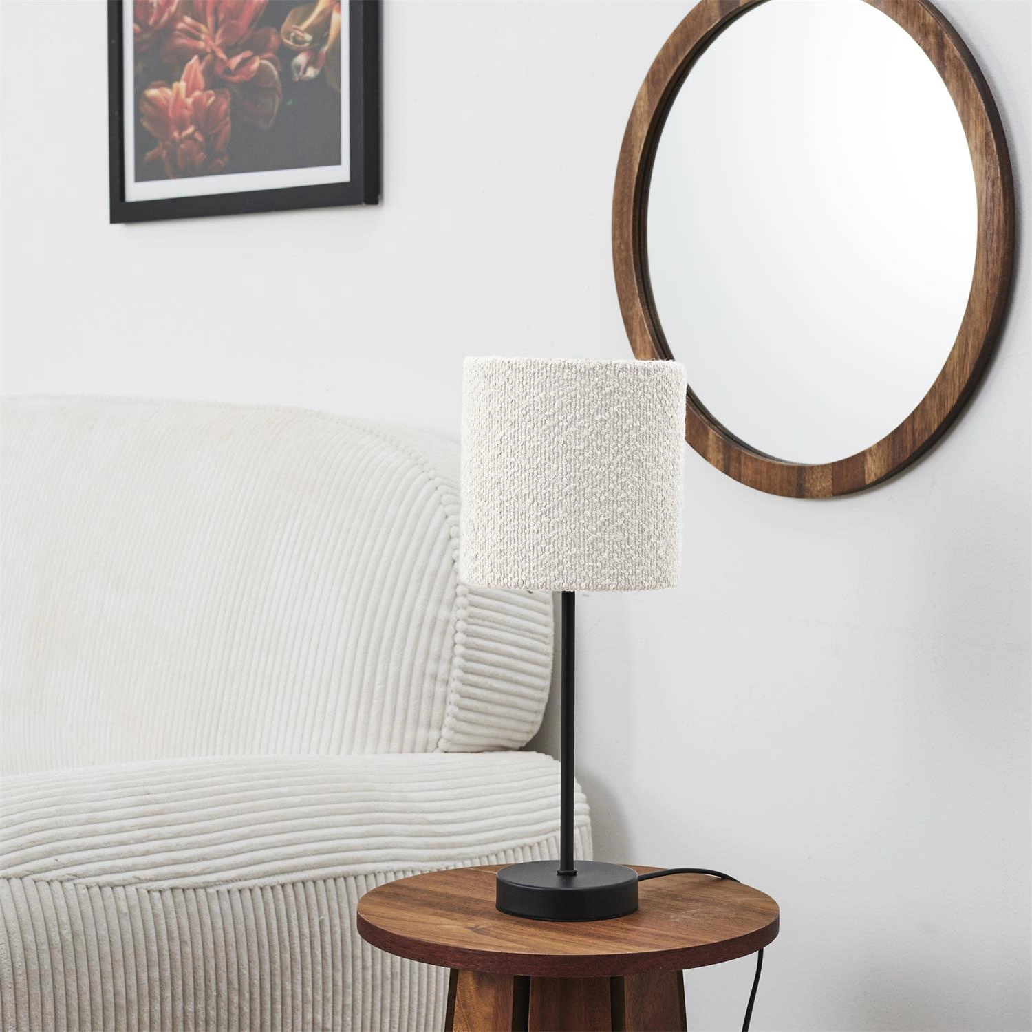 Podstawa lampy wykonana jest z żelaza, co gwarantuje jej stabilność i trwałość. Klosz wykonany jest z poliakrylu, który doskonale imituje tkaninę boucle. Ta kombinacja materiałów sprawia, że lampa jest nie tylko estetyczna, ale także odporna na uszkodzenia.