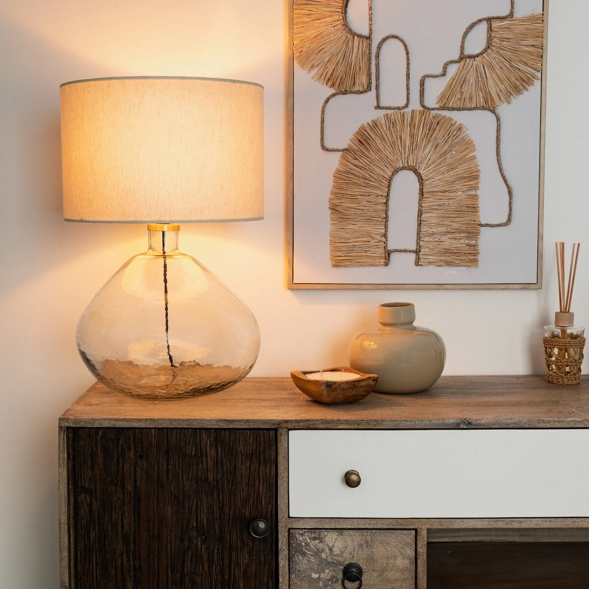 Przedstawiamy lampkę Melly w kolorze białym i transparentnym, która stanowi doskonałe połączenie surowych, naturalnych materiałów z nowoczesnym designem. Baza lampy, wykonana ze szkła, ma zaokrąglony kształt i ręcznie wykonane wykończenie, które dodaje jej unikalnego charakteru. Cylindryczny abażur z bawełny w neutralnym kolorze dodaje lampie miękkości i elegancji. Ta stylowa lampka będzie idealnym dodatkiem do salonu, sypialni, garderoby czy gabinetu, a jej odbijające się światło doda pomieszczeniu poetyckiego klimatu.