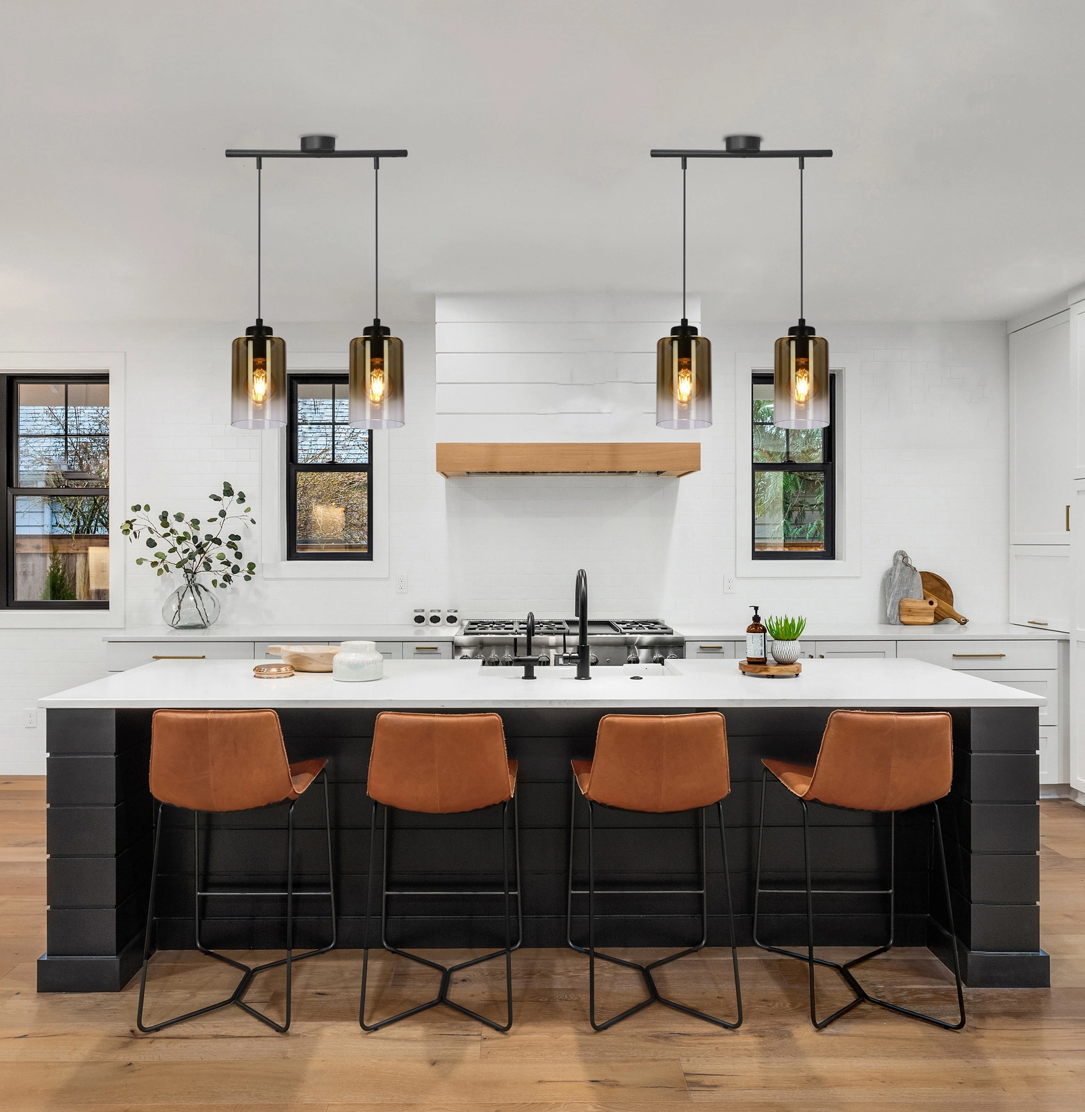 - Jej klosze wykonane są z bursztynowego szkła, które łagodnie przechodzi w przezroczyste, tworząc efektowną grę światła i cienia.
