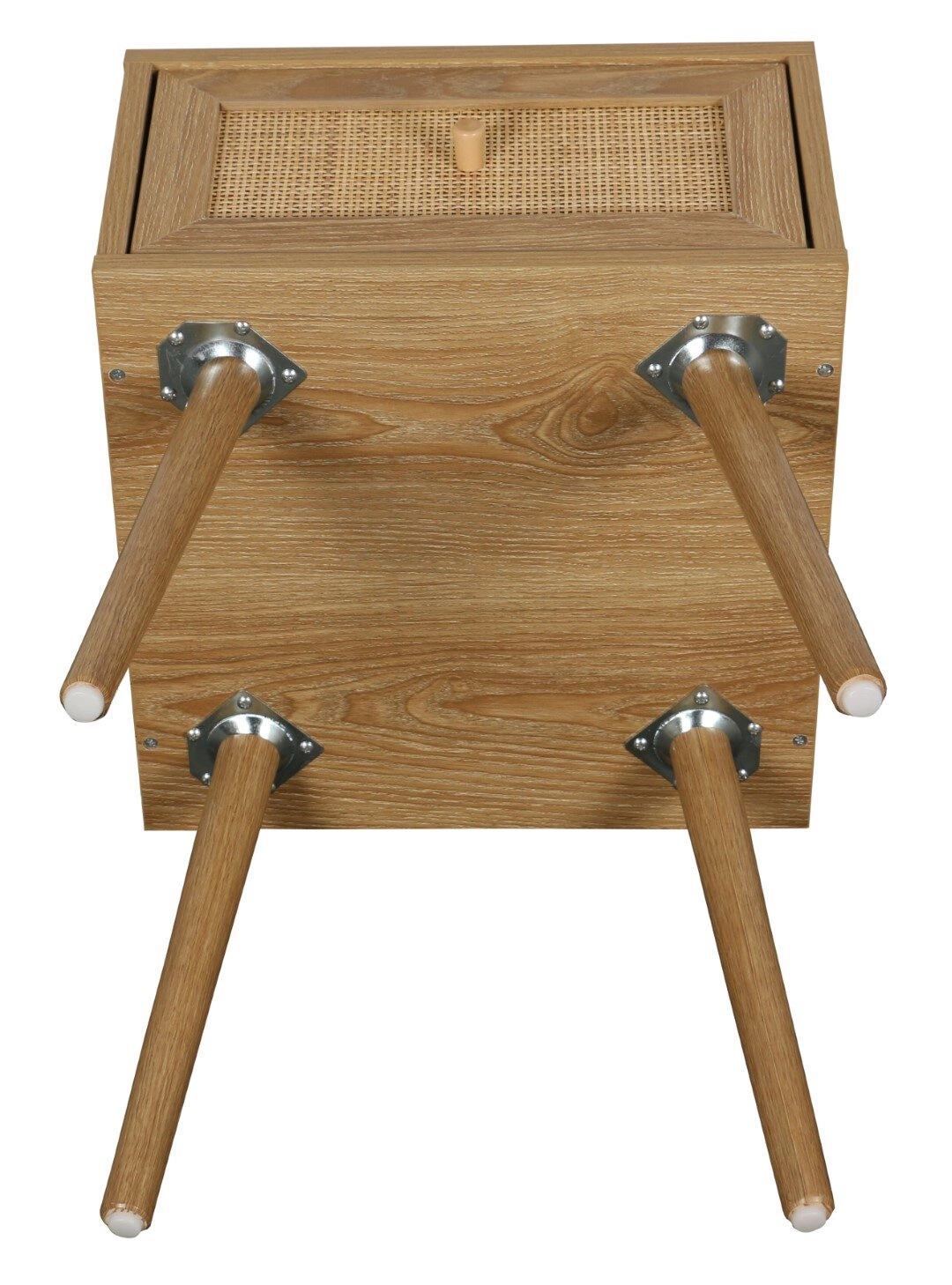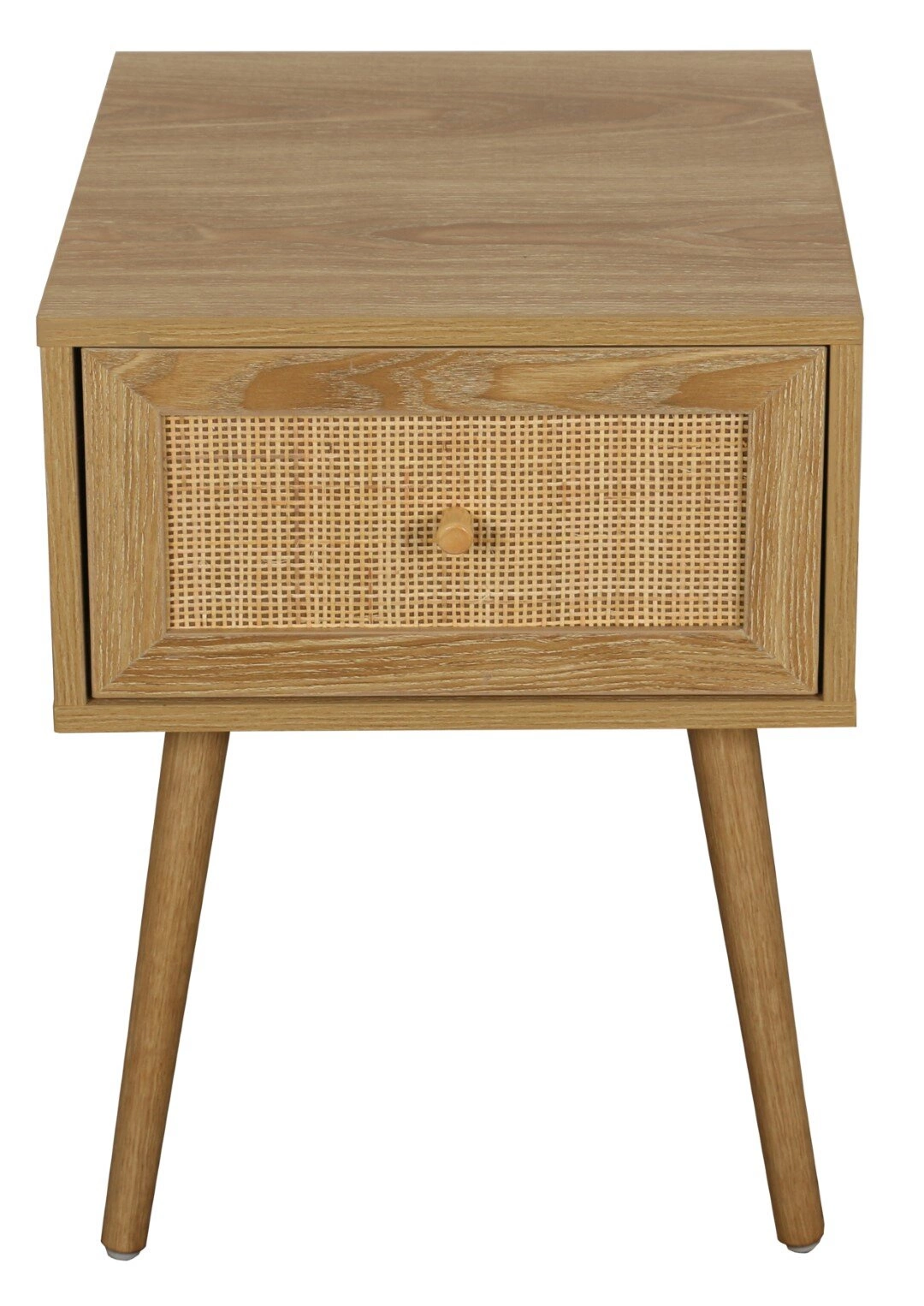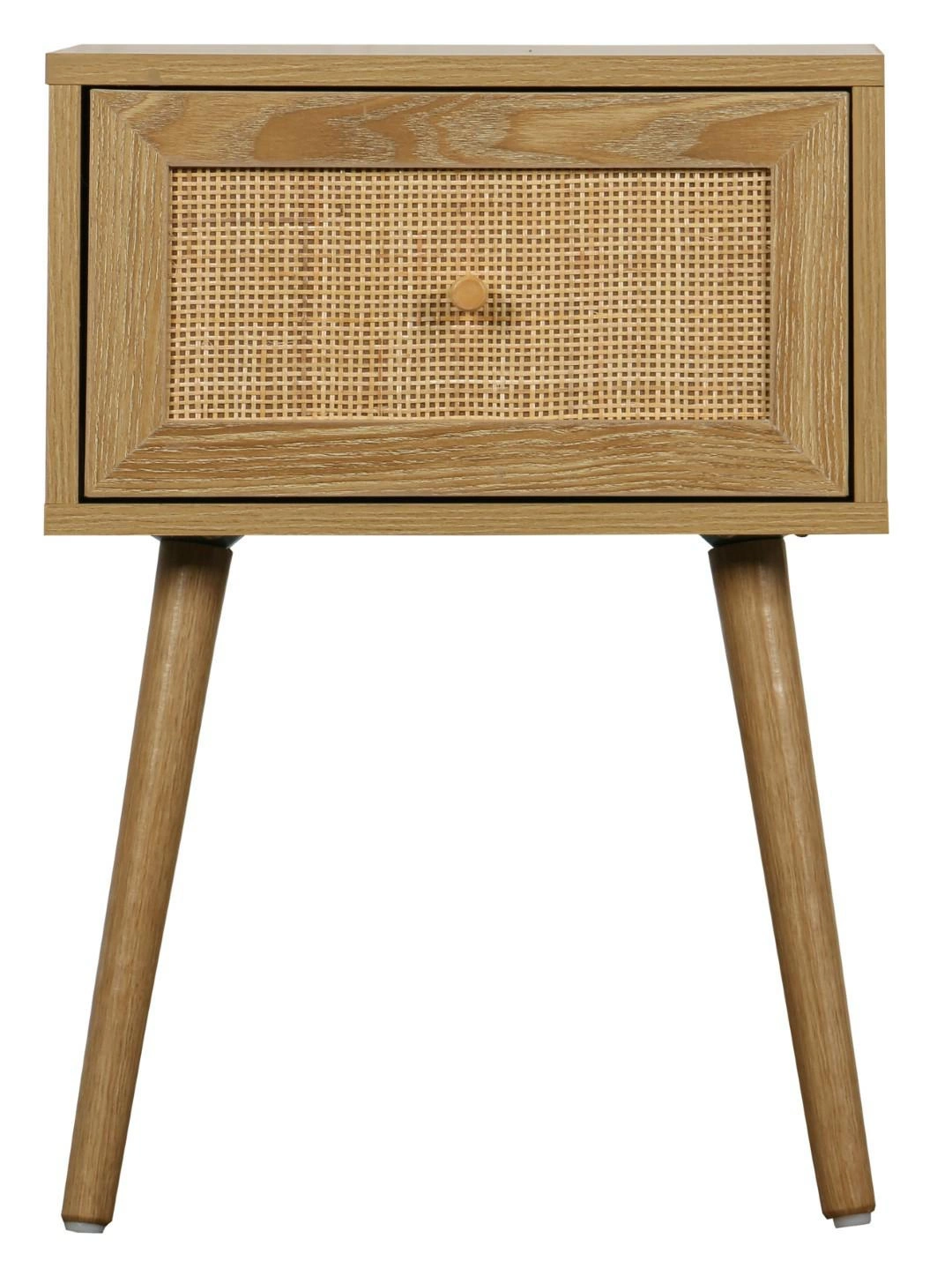 Front szafki nocnej Ballo zachwyca autentyczną plecionką rattanową, która stanowi nie tylko modny akcent, ale też podkreśla lekkość i swobodę stylu boho. Korpus i blat utrzymane w odcieniu naturalnego dębu wprowadzają do wnętrza harmonię oraz łatwo łączą się z innymi, jasnymi meblami czy tekstyliami. Stelaż wykonany z drewna sosnowego zapewnia stabilność, a półmatowe wykończenie mebla sprawia, że prezentuje się elegancko i nie przytłacza aranżacji.