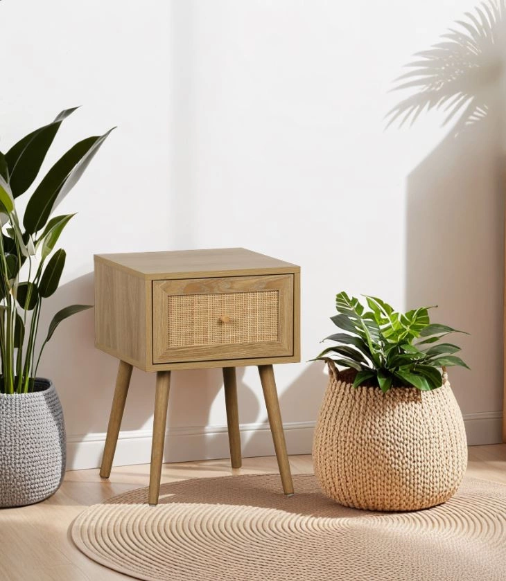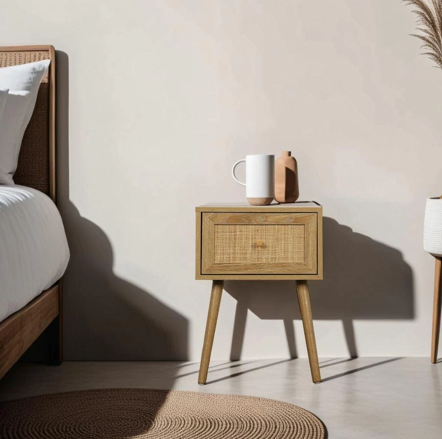 Szafka nocna boho Ballo Intesi to połączenie naturalnego uroku i funkcjonalności, które odmienia każdą sypialnię. Wykonana w kolorze naturalnego dębu, z dekoracyjnym, ażurowym frontem z rattanu i praktyczną szufladą na podręczne drobiazgi, wprowadza do wnętrza ciepło i przytulny klimat. Kompaktowa forma (szerokość i głębokość 39 cm, wysokość 55 cm) sprawia, że jest to idealna mała szafka nocna nie tylko do większych, ale również do mniejszych sypialni.