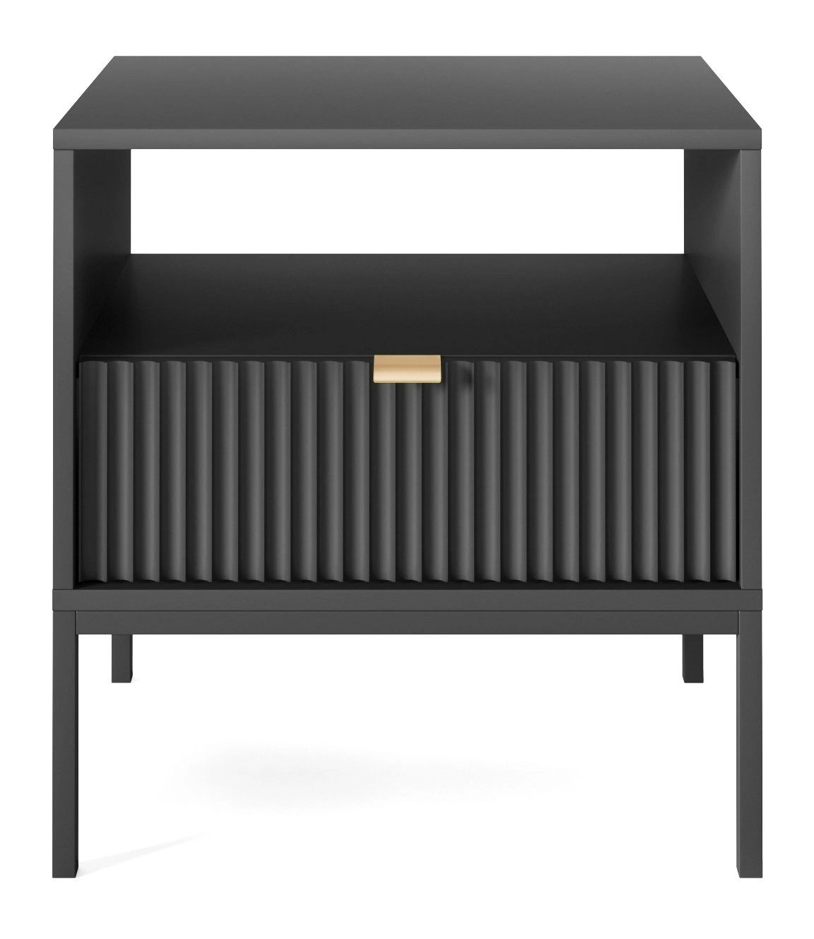 Ponadto, dostępna w kilku kolorach, pozwoli Ci idealnie dopasować ją do Twojego dotychczasowego wystroju. Przestronna półka pozwoli Ci na przechowywanie niezbędnych przedmiotów, takich jak lampka nocna czy ulubiona książka, a piękne ryflowanie na froncie szuflady sprawią, że mebel stanie się prawdziwą ozdobą Twojej sypialni. Dodatkowo, aluminiowy uchwyt w kolorze złota doda szafce nowoczesnego charakteru i elegancji.