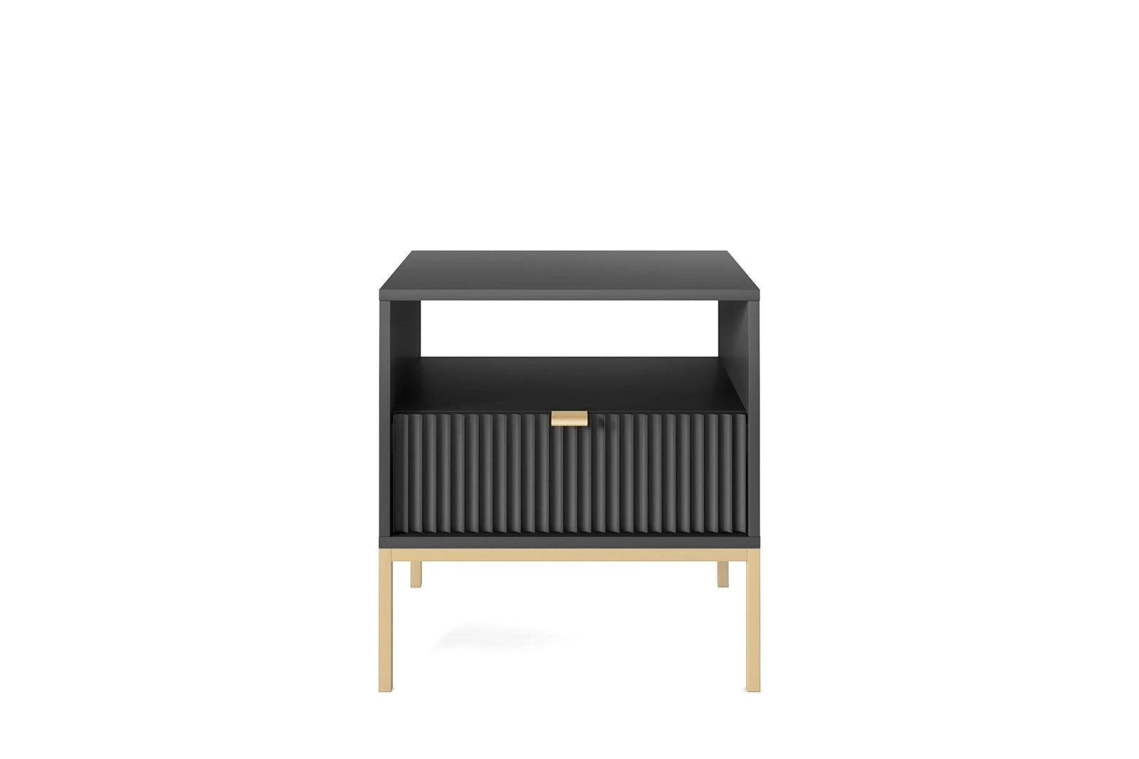 . Jej ryflowany front szuflady i aluminiowy uchwyt w kolorze złotym dodadzą uroku i elegancji, a praktyczne rozmiary i głębokość pozwolą na uporządkowanie różnych przedmiotów. Metalowe nogi zapewnią stabilność i łatwość w utrzymaniu czystości pod meblem. To idealne rozwiązanie dla osób, które cenią zarówno funkcjonalność, jak i estetykę w swoim domu.