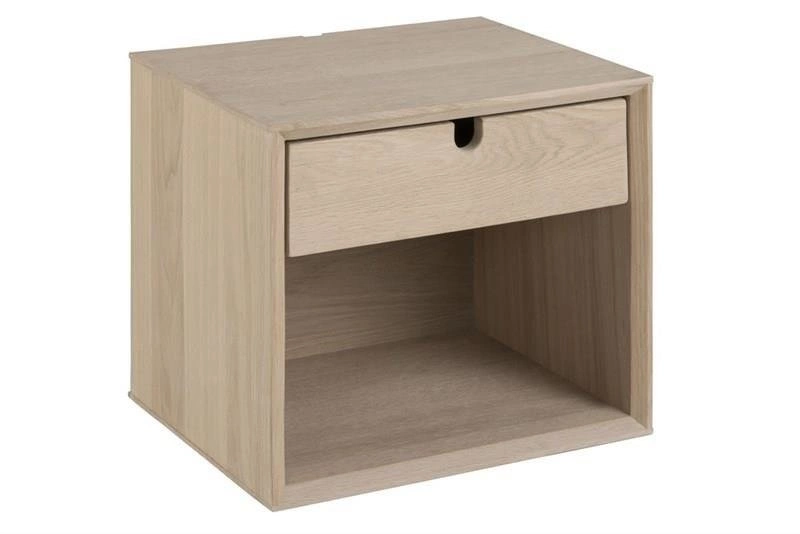 Szafka nocna Century wykonana została z płyty MDF fornirowanej dębem. Dodatkowo została zabezpieczona olejem z białym pigmentem, który wydobywa naturalne piękno drewna. Szafka może zarówno stać kolo łóżka ale również można zawiesić ją na ścianie. Posiada szufladę, która pomoże utrzymać porządek oraz przechowa niezbędne rzeczy.