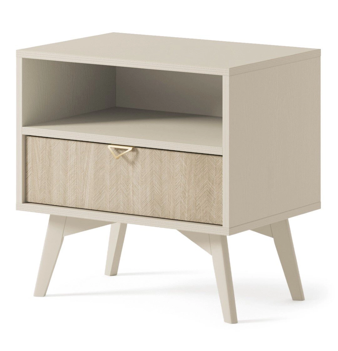 Szafka nocna Sage to połączenie dwóch stylów - boho i glamour, które sprawiają, że ten mebel jest niezwykle ponadczasowy i wyjątkowy. Jest to najlepszy wybór, który dodaje charakteru i elegancji do każdej sypialni. Jego korpus wykonany jest z wysokiej jakości płyty laminowanej o grubości 16 mm, co gwarantuje trwałość i solidność. Obrzeża zastosowane na korpusie i froncie mają grubość 0,5 mm i są wykonane z wytrzymałego materiału ABS. Dzięki temu szafka jest odporna na uszkodzenia i zarysowania, co sprawia, że będzie cieszyć nasze oczy przez wiele lat. Niezwykły wzór w jodełkę na froncie szafki dodaje jej naturalnego uroku, a złote, delikatne uchwyty nadają jej wyrafinowanego wyglądu.