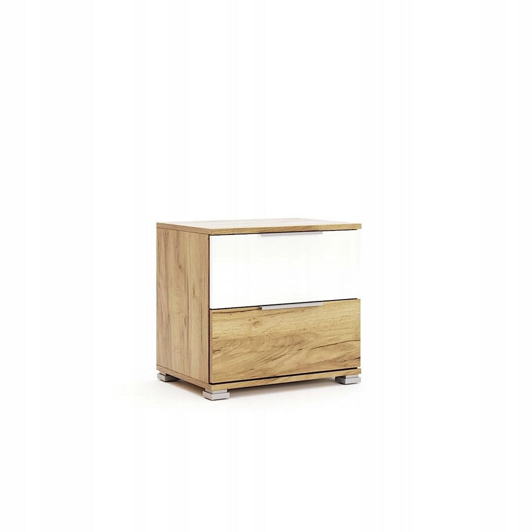 Jednak to nie tylko funkcjonalność czyni tę szafkę wyjątkową. Jej minimalistyczny design sprawia, że doskonale komponuje się z różnorodnymi stylami wnętrz, dodając im subtelnej elegancji. Połączenie dębu craft z białym połyskiem nadaje szafce nowoczesny i świeży wygląd, który przyciąga uwagę i nadaje charakteru całej sypialni.