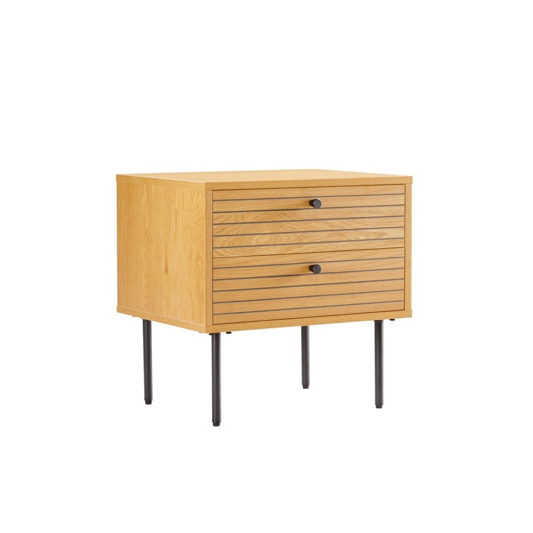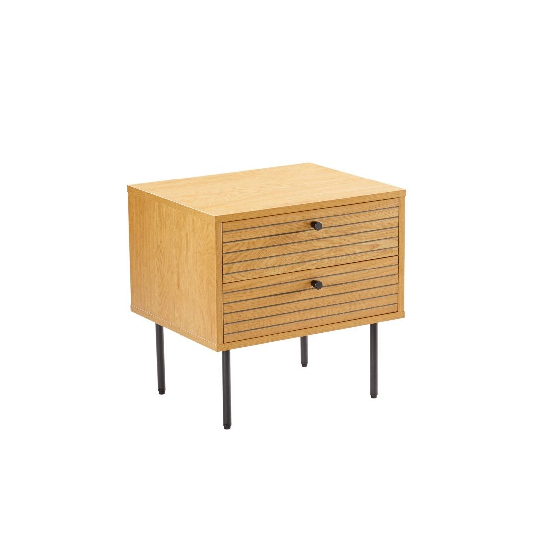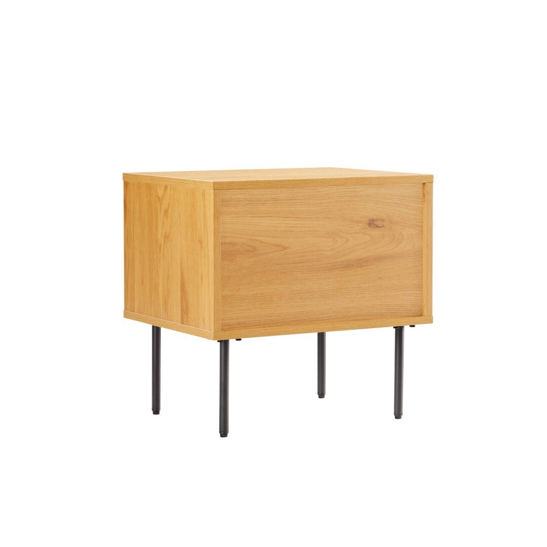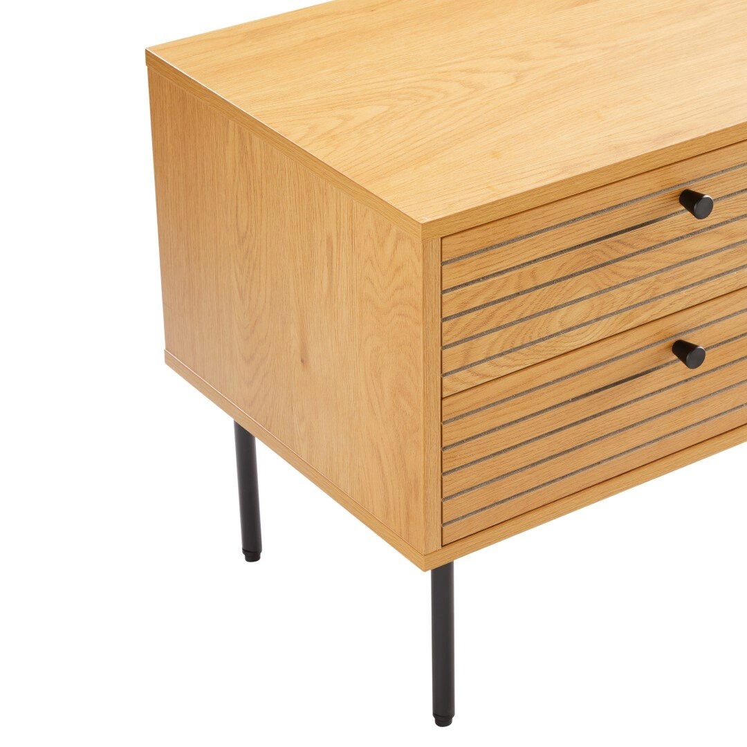 Dzięki imitacji forniru dębowego, szafka prezentuje się bardzo stylowo i naturalnie, idealnie komponując się z różnymi aranżacjami wnętrz. Fronty szuflad z efektownym, poziomym wzorem dodają szafce charakteru i oryginalności. Czarne, metalowe uchwyty nadają meblowi nowoczesnego wyglądu, który doskonale współgra z metalową podstawą komody.