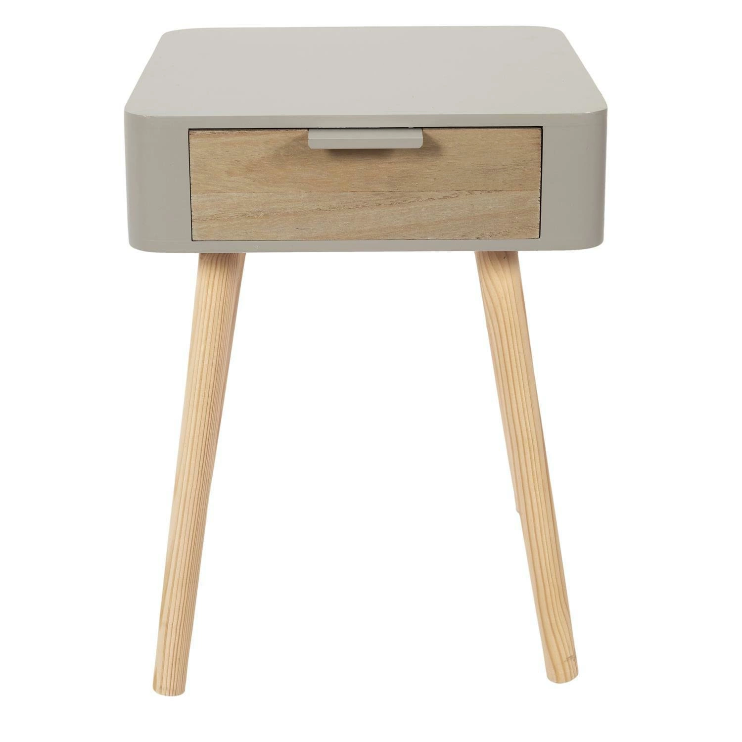 Drewniana szafka nocna Padano to mebel idealny do sypialni w stylu skandynawskim. Szafka nocna na czterech nogach z litego drewna sosnowego pomalowana została na szaro. Korpus szafki został wyprodukowany z mocnej płyty MDF. Szafka posiada pojemną szufladę, której front pokryty został laminatem imitującym drewno.