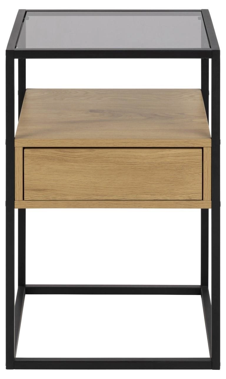 Szafka nocna Randolf to stylowe połączenie elementów szklanych, metalowych i drewnianych. Jej szkielet wykonany jest z malowanego proszkowo metalu w kolorze czarnym. Kwadratowy blat to dymione szkło hartowane, zaś znajdująca się pod nim szuflada to w całości płyta MDF w okleinie w kolorze dębu. Szuflada otwiera się poprzez kliknięcie, pozbawiona jest uchwytów, co jest jej dużym atutem. Dzięki temu cała konstrukcja wygląda schludnie, estetycznie i elegancko. Zamykana szuflada stanowi świetnie miejsce na ukrycie prywatnych rzeczy, zaś blat idealnie sprawdzi się jako miejsce na ulubioną książkę lub lampkę nocną.