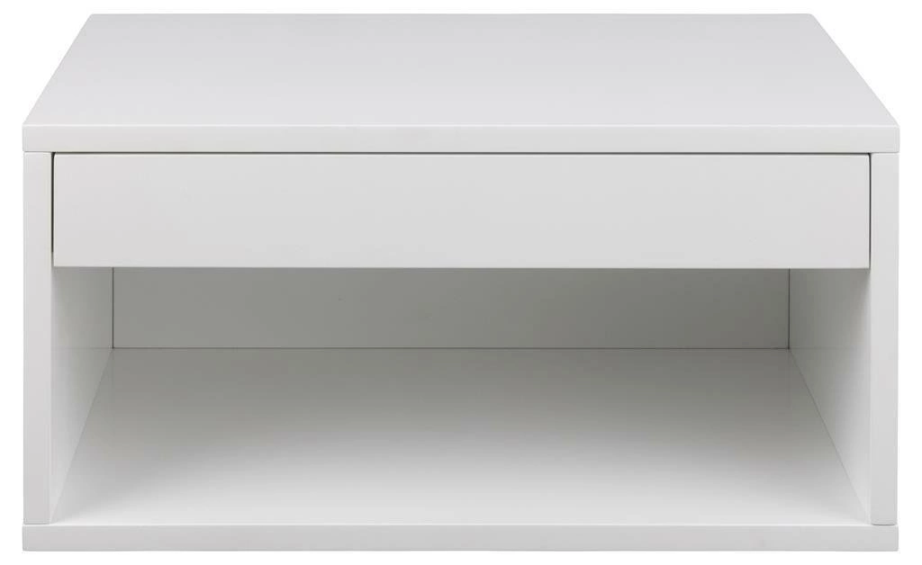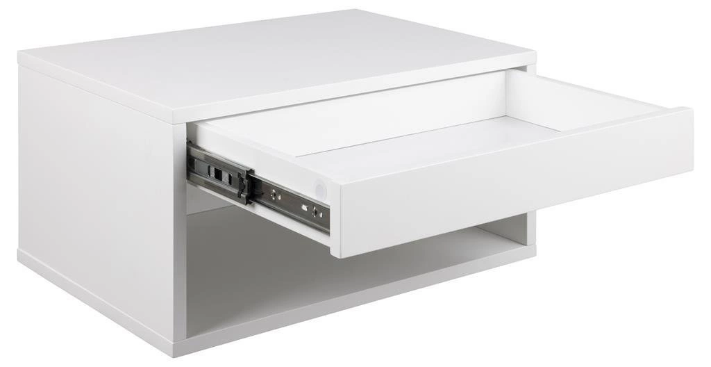 Wisząca szafka nocna Cholet wykonana z płyty MDF, która została pokryta czarnym lakierem. Posiada szufladę na metalowych prowadnicach, jest to gwarancja wygody i bezpieczeństwa. Możesz w niech schować swoje prywatne rzeczy, tak by byłe one niewidoczne dla innych. Szuflada bez uchwytów sprawia, że cała konstrukcja jeszcze bardziej zyskuje na elegancji. Mebel posiada jeszcze otwartą półkę, na której możesz położyć swoje ulubione książki lub inne dekoracje. Szafka dostępna w kolorze czarnym i białym.