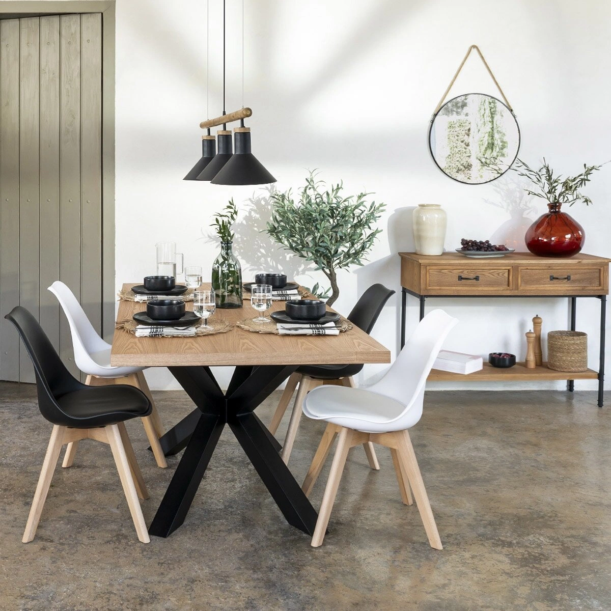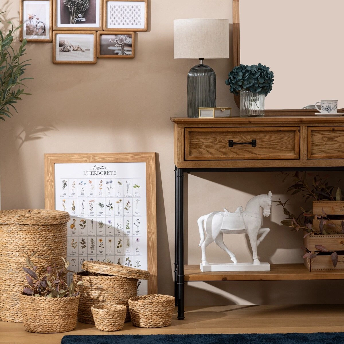 Konsola Danik marki Atmosphera to rustykalny stolik przyścienny o szerokości 110 cm, wykonany z wytrzymałej płyty pilśniowej i oparty na solidnej, metalowej podstawie. Front zdobiony subtelną sztukaterią oraz połączenie naturalnego blatu z czarnymi nogami sprawiają, że mebel przyciąga wzrok i nadaje wnętrzu przytulny, sielski charakter. Konsola z praktycznymi szufladami oraz półką pomieści niezbędne drobiazgi, idealnie sprawdzając się jako konsola do przedpokoju, sypialni czy salonu.