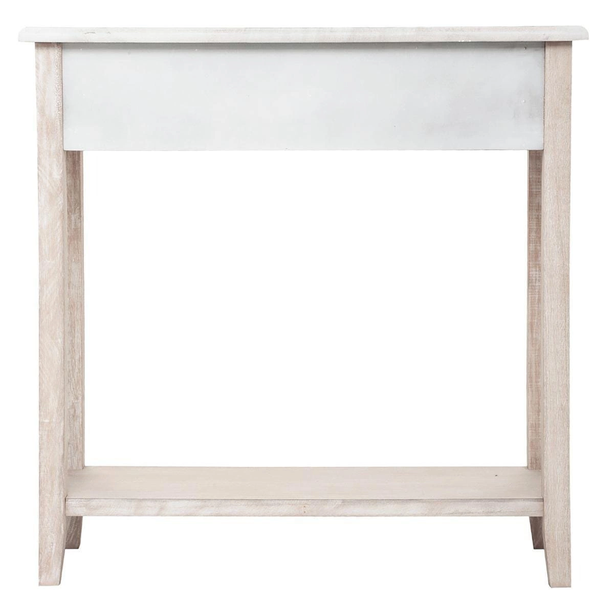 Konsola Hina marki Atmosphera to wąski stolik przyścienny o wymiarach 80×80×30 cm, wykonany z naturalnego bielonego drewna paulownia i wyposażony w praktyczną półkę oraz dwie pojemne szuflady. Rustykalna stylistyka, zdobione fronty i szczotkowane wykończenie nadają jej unikalny, prowansalski charakter. Ten mebel idealnie sprawdzi się zarówno jako konsola do przedpokoju, jak i elegancka toaletka do sypialni czy dekoracyjny stolik do salonu.