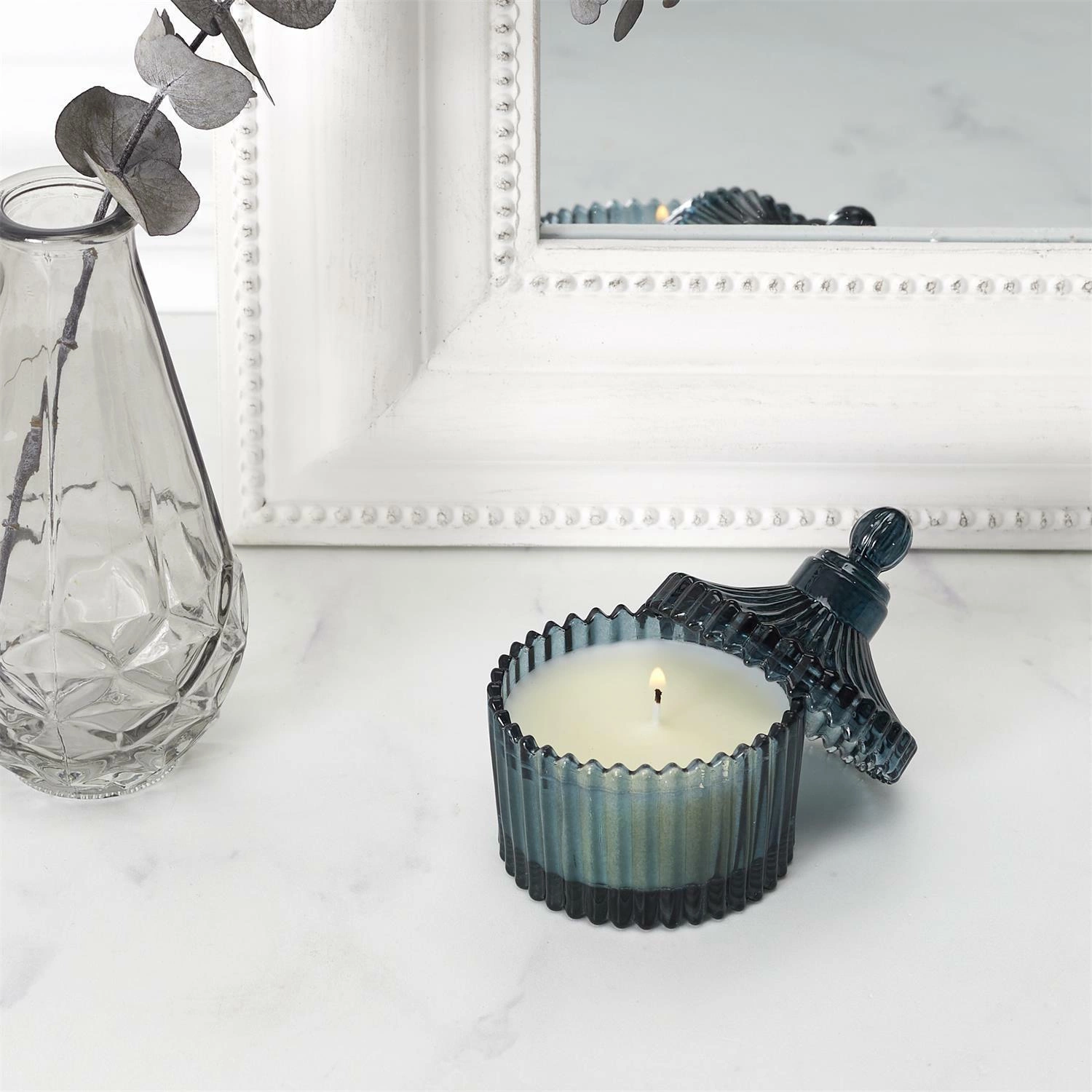 Daj oczarować się świecą w zjawiskowym świeczniku inspirowanym szkłem bohemskim. Świeca w pojemniku z pokrywką daje niesamowicie klimatycznie rozproszone światło podczas palenia. To jednocześnie fantastyczna ozdoba, gdy nie decydujemy się używać świecy. Świeca perfumowana o zapachu bursztynu ukoi nerwy po ciężkim dniu swoim subtelnym, świeżym zapachem. Świeca zapewnia trwałość palenia aż 10 godzin.