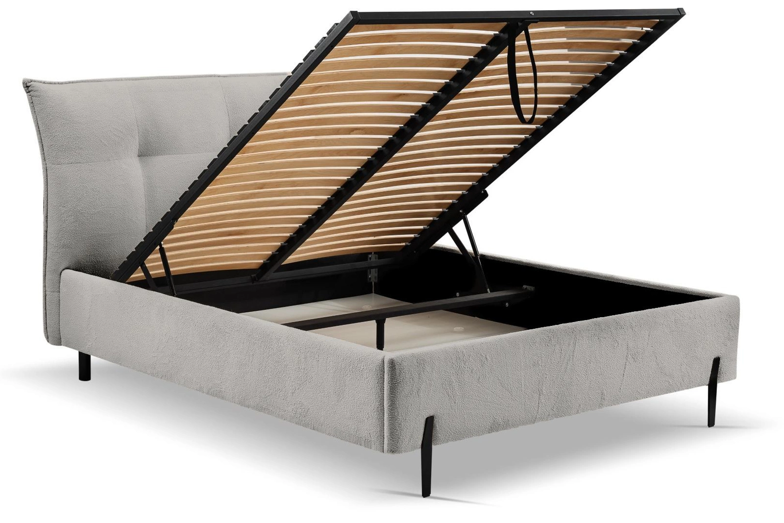 Łóżko tapicerowane Biscuit to nie tylko estetyka, ale również praktyczność. Model wyposażono w obszerny pojemnik na pościel, który pozwala na wygodne przechowywanie kołder, poduszek czy pościeli sezonowej – bez konieczności zajmowania dodatkowej przestrzeni w szafach. Stelaż w zestawie zapewnia odpowiednie podparcie dla materaca 160x200 cm, zwiększając trwałość mebla i wygodę snu. Wysokość siedziska 47 cm sprawia, że wstawanie z łóżka jest wygodne nawet dla osób starszych lub mających ograniczoną mobilność.
