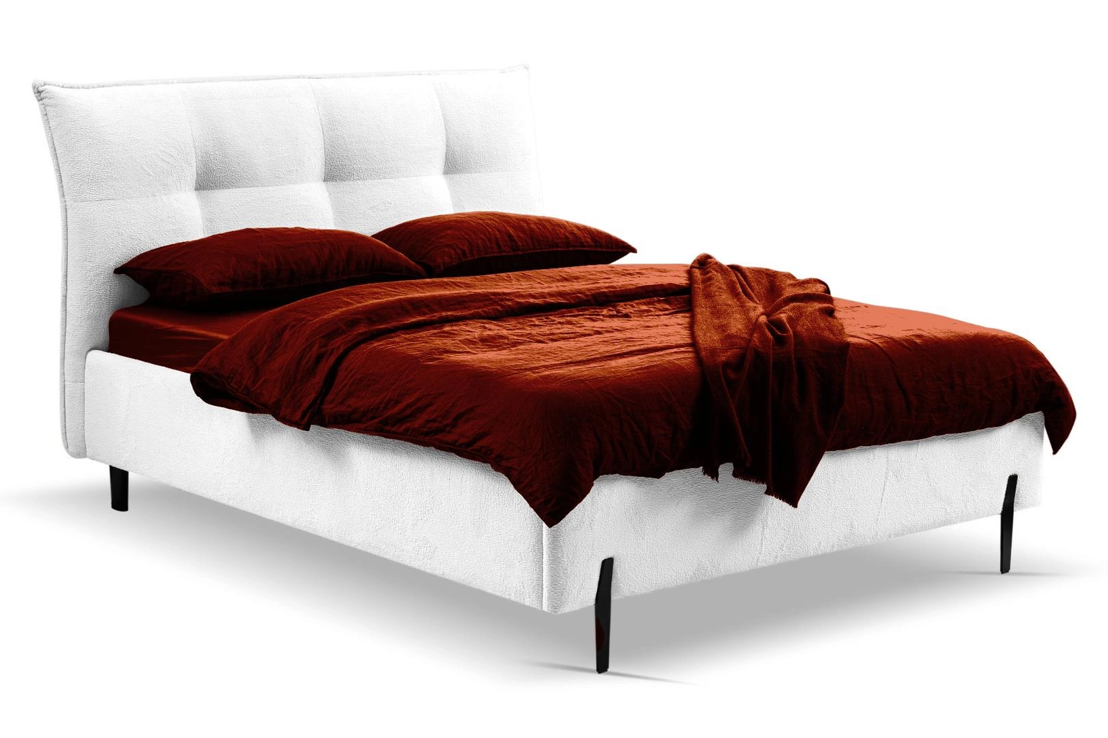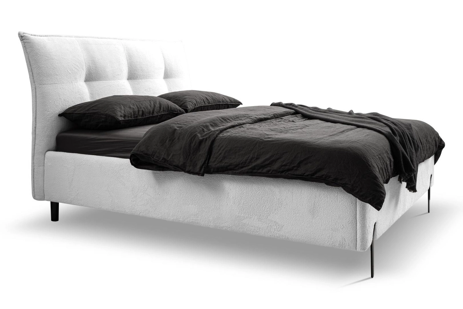 Białe łóżko tapicerowane Biscuit zachwyca subtelną formą i stonowaną kolorystyką. Tapicerka Cosy w połączeniu z wysokim, ozdobnie pikowanym zagłówkiem tworzy przytulny klimat, a czarne metalowe nogi nadają całości nowoczesnego charakteru. Taki design świetnie wpisuje się w aranżacje skandynawskie, minimalistyczne czy współczesne, rozjaśniając przestrzeń i optycznie powiększając nawet mniejsze sypialnie.