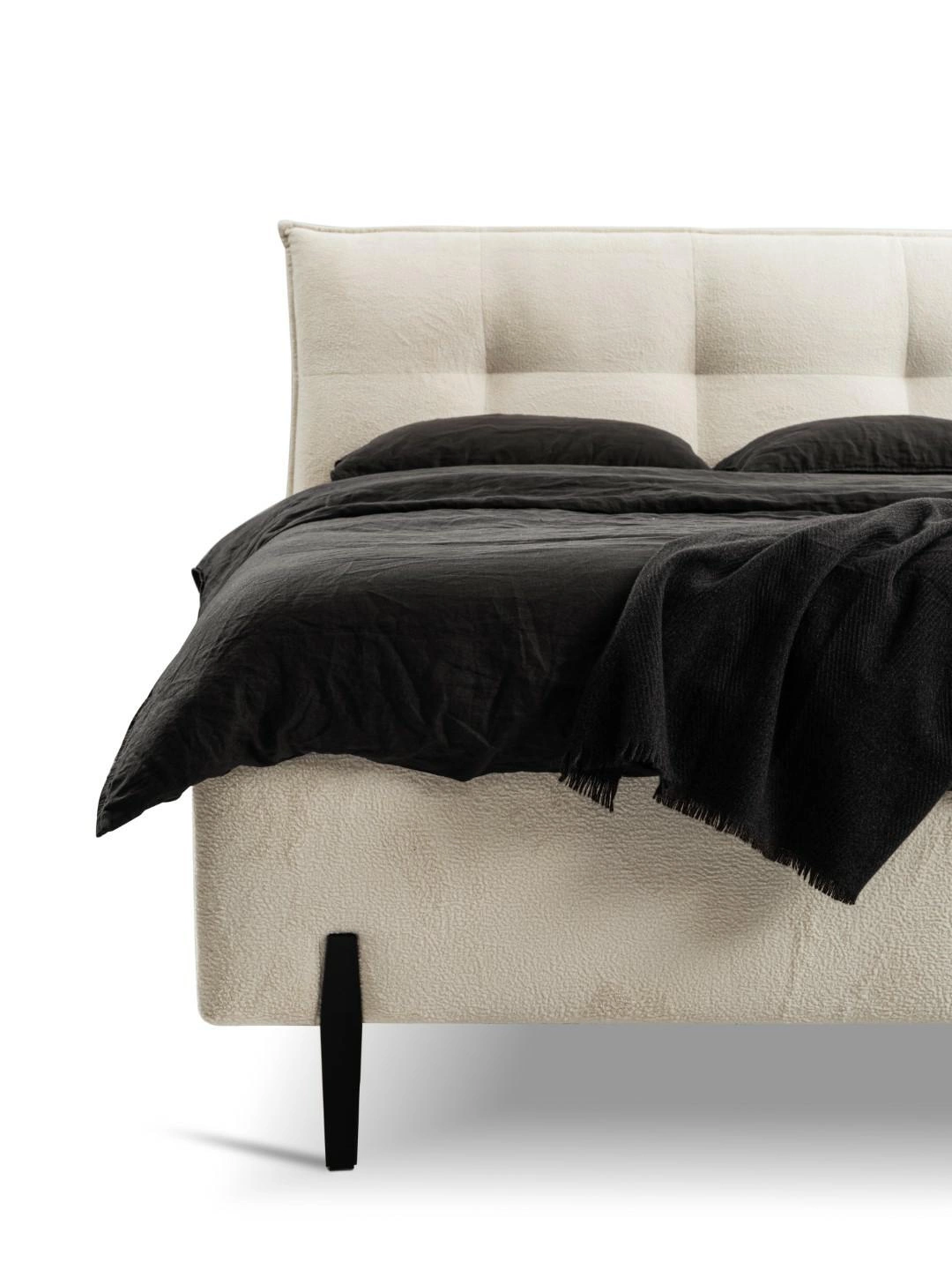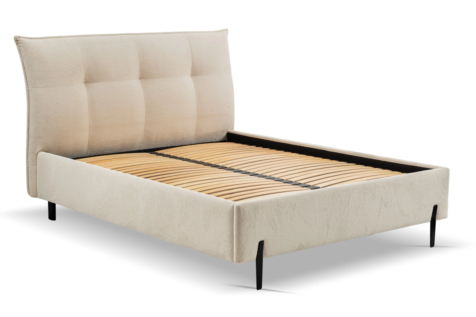 Łóżko Biscuit 160x200 beżowe doskonale wpisuje się w najnowsze trendy aranżacyjne, tworząc przestrzeń pełną ciepła i harmonii. Jasny odcień tkaniny rozjaśnia wnętrze, a miękkie, tapicerowane boki oraz wysokie zagłowie zapewniają nie tylko wygodę podczas relaksu, ale też przytulny klimat. Prosta, geometryczna forma i minimalistyczne, czarne nogi czynią ten model idealnym wyborem do sypialni urządzonej w skandynawskim stylu.