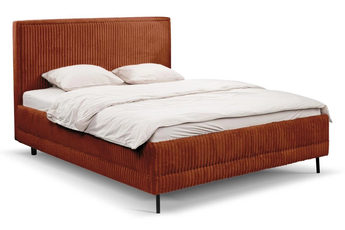 Foggy to łóżko nowoczesne, które stanowi efektowne centrum każdej sypialni. Tapicerowane wezgłowie w odcieniu terakoty przyciąga wzrok, wprowadzając do wnętrza przytulność oraz ciepło. Prosty, prostokątny kształt oraz czarne, metalowe nogi podkreślają minimalistyczny, a zarazem wyrazisty charakter tego mebla. Dzięki harmonijnemu połączeniu kolorów i materiałów łóżko pasuje zarówno do aranżacji skandynawskich, jak i nowoczesnych przestrzeni.