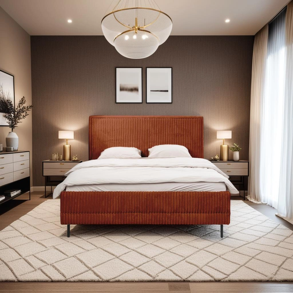 - Nowoczesny design i kolor terakoty – łóżko staje się mocnym akcentem dekoracyjnym