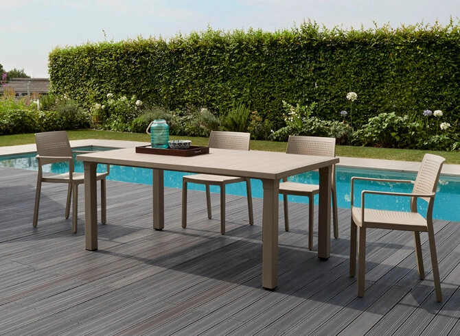 Dzięki możliwości rozsuwania blatu od 170 do 220 cm, stół jest niezwykle wszechstronny, doskonały zarówno na formalne kolacje, jak i na nieformalne spotkania. Dwie listwy przedłużające blat gwarantują płynne i łatwe poszerzanie stołu, dostosowując go do zmieniających się potrzeb. Blat z listew technopolimerowych oraz nogi z powlekanego aluminium zapewniają nie tylko estetyczny wygląd, ale również trwałość i łatwość utrzymania czystości. Stopki z tworzywa, dodające stabilizacji, są przyjazne dla powierzchni tarasu, nie rysując jej. Stół Per3 to nie tylko mebel, ale także element, który podkreśli urok i funkcjonalność Twojej przestrzeni na zewnątrz. Jego uniwersalny design sprawia, że pasuje do różnych stylów aranżacyjnych, dodając im nowoczesnego charakteru. Jeśli szukasz stołu, który łączy w sobie elegancję, funkcjonalność i trwałość, Stół Rozkładany Per3  będzie doskonałym wyborem dla Ciebie.