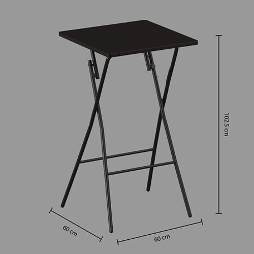 Prezentowany stół barowy składany, o wymiarach 60x60cm, to idealne rozwiązanie dla osób ceniących sobie połączenie elegancji i funkcjonalności. Wykonany z solidnej metalowej podstawy oraz blatu z płyty MDF, charakteryzuje się wytrzymałością i stabilnością. Jego czarny kolor dodaje mu uniwersalności, dzięki czemu doskonale wpisze się w każde, nawet najbardziej wymagające wnętrza.
