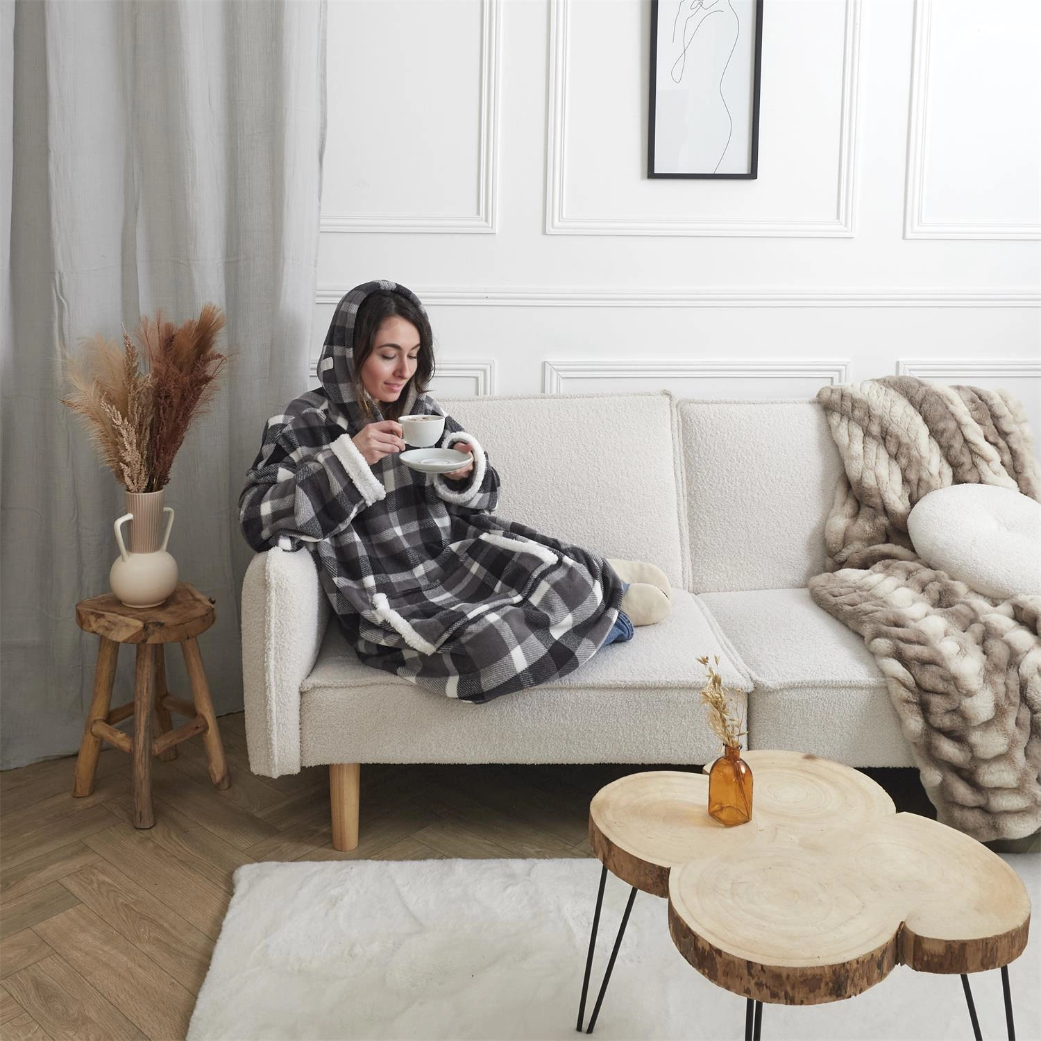 Intesi Snuddie czarna to koc bluza z kapturem, która łączy wygodę grubego, ciepłego koca z funkcjonalnością luźnej bluzy, zapewniając wyjątkowy komfort w domowym zaciszu. Wykonana z miękkiego materiału o wysokiej gramaturze, doskonale otula podczas relaksu na kanapie lub w sypialni. Wyrazista czarna kratka podkreśla nowoczesny charakter, a praktyczny kaptur i szerokie rękawy sprawiają, że to idealny wybór na chłodne wieczory.