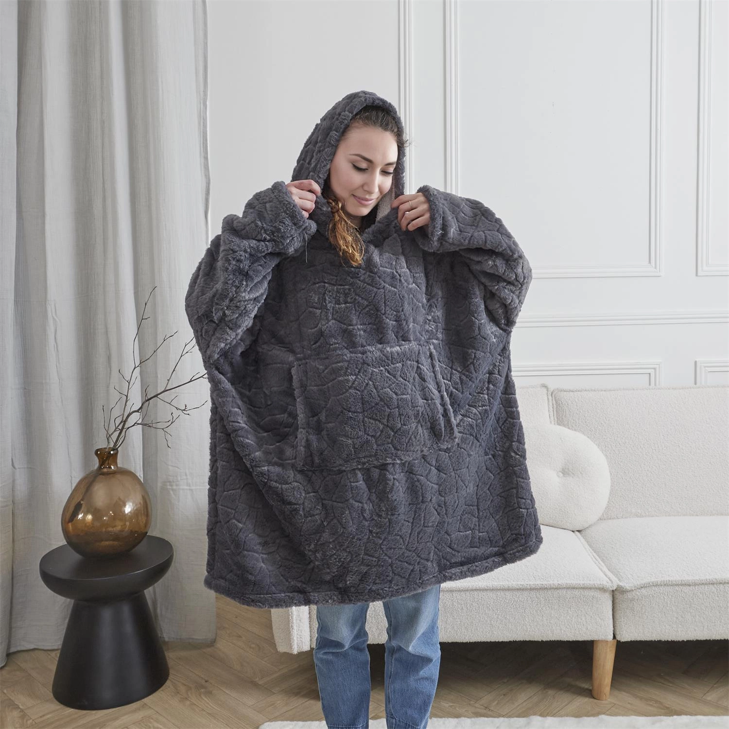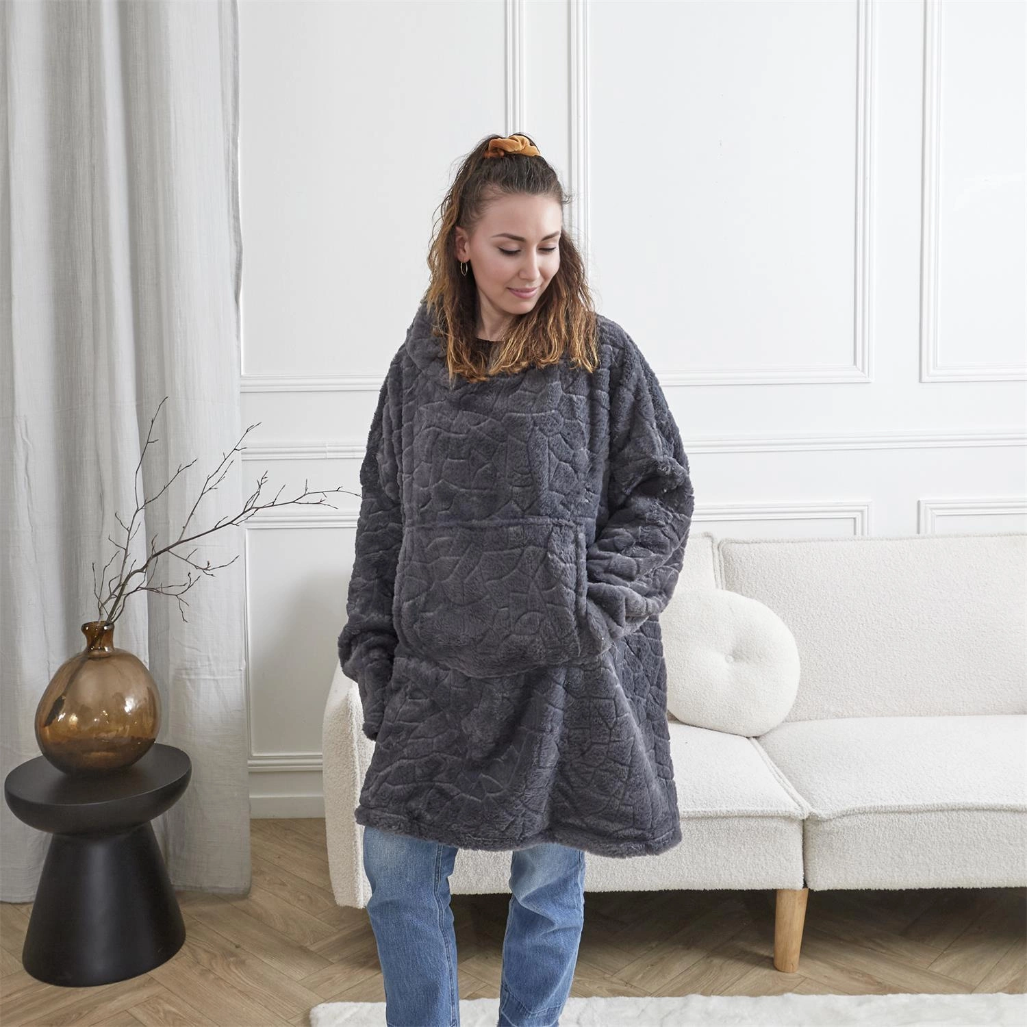 Połączenie funkcjonalności i stylu sprawia, że ten gruby koc z kapturem jest idealnym rozwiązaniem na zimę. Możesz go nosić jak luźną bluzę, a jednocześnie cieszyć się ciepłem, jakie daje tradycyjny pled. Uniwersalny szary kolor oraz futrzane wykończenie wpisują się w nowoczesne aranżacje wnętrz, styl skandynawski oraz boho, tworząc spójną całość z domowym otoczeniem.