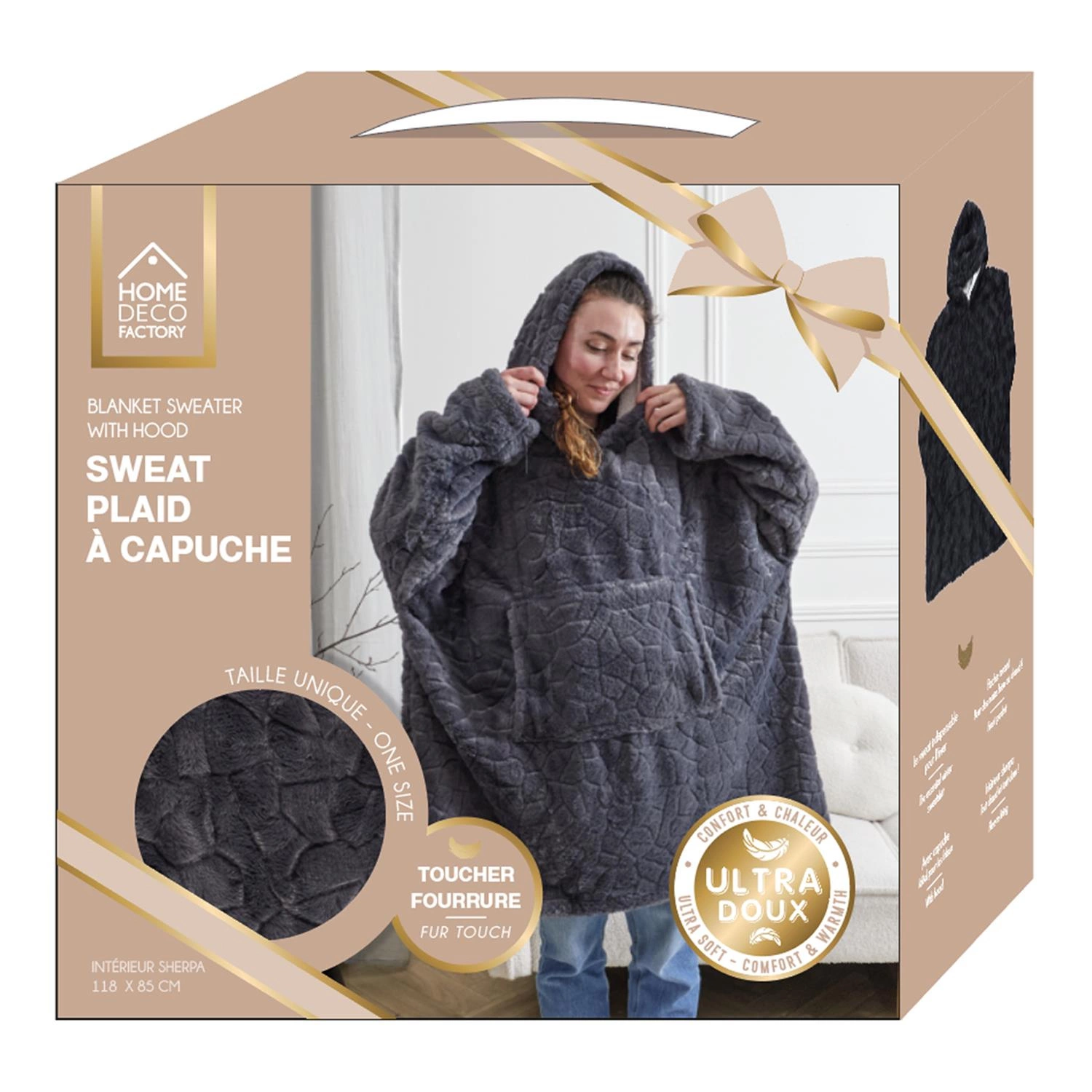 Intesi szary bluzo koc z futerka o wymiarach 120×83 cm to doskonałe połączenie miękkiego koca na kanapę z wygodą bluzy z kapturem. Wykonany z przyjemnego w dotyku futrzanego materiału, ten ciepły bluzo koc otuli Cię podczas zimowych wieczorów w salonie, sypialni lub pokoju młodzieżowym. Dzięki praktycznemu kapturowi oraz łatwości w praniu, to komfortowy wybór na każdy chłodny dzień.
