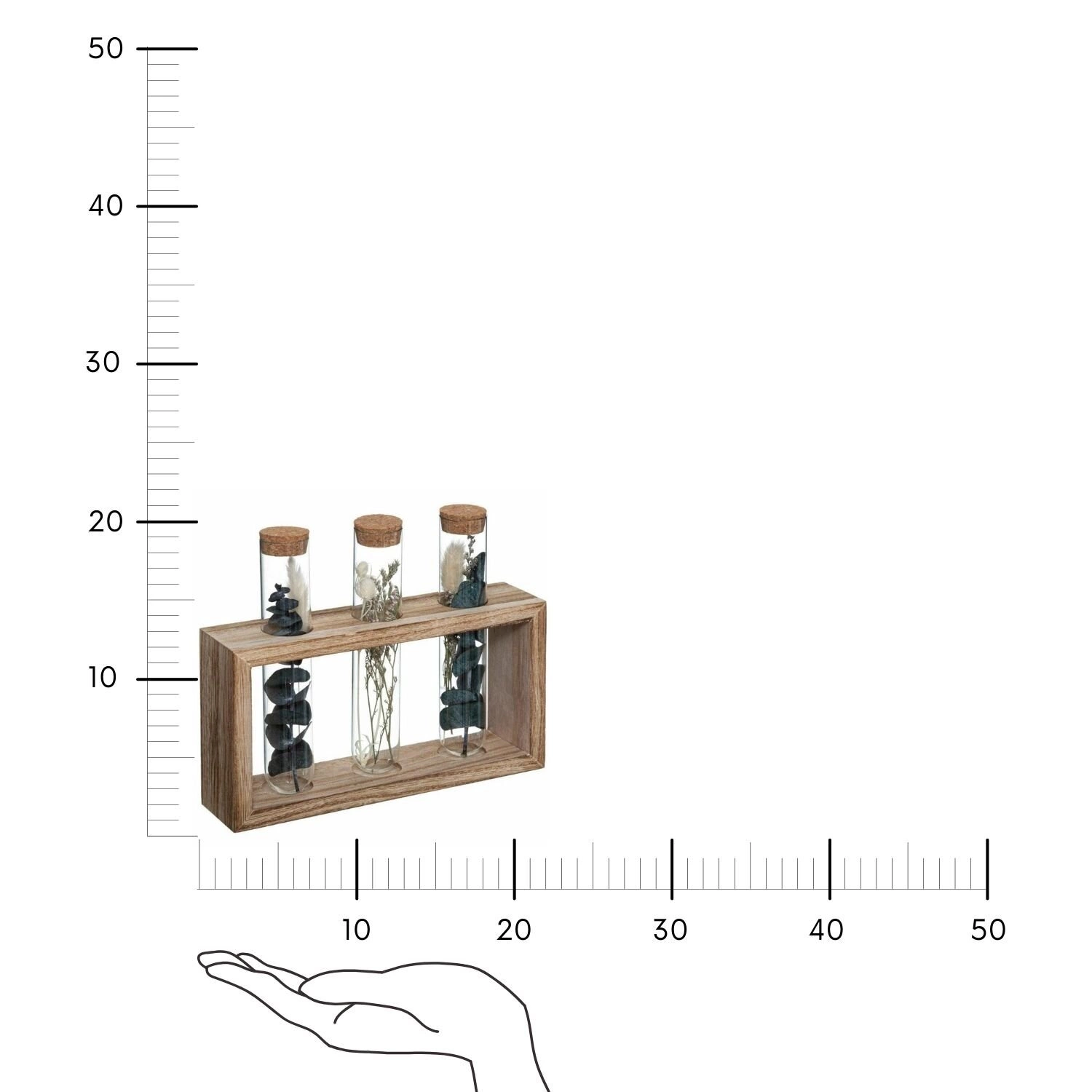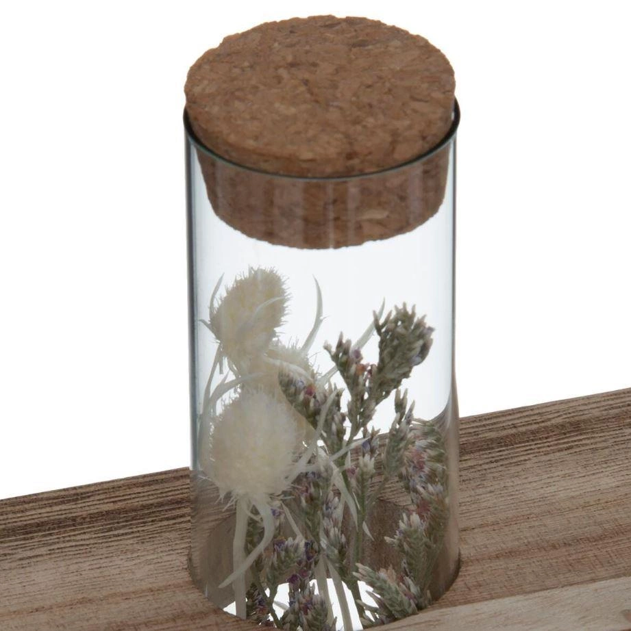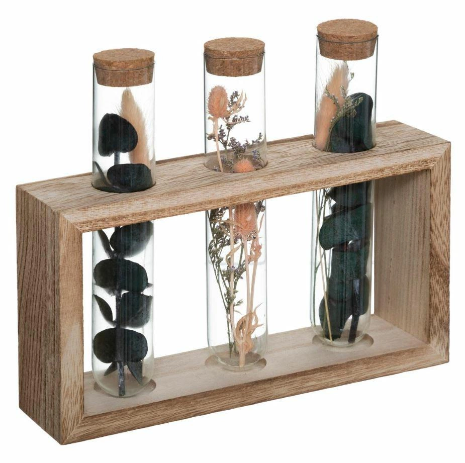 Wyróżniający się design tego potrójnego wazonu dekoracyjnego opiera się na połączeniu trzech szklanych rurek osadzonych w jasnobrązowej, drewnianej podstawie. Każdy z wazonów został wypełniony starannie dobranymi suszonymi kwiatami, dzięki czemu całość prezentuje się niezwykle efektownie i niepowtarzalnie. Taka kompozycja to doskonała alternatywa dla klasycznego wazonu na kwiaty – nie wymaga wody ani regularnej wymiany roślin, a mimo to zawsze wygląda świeżo i stylowo.